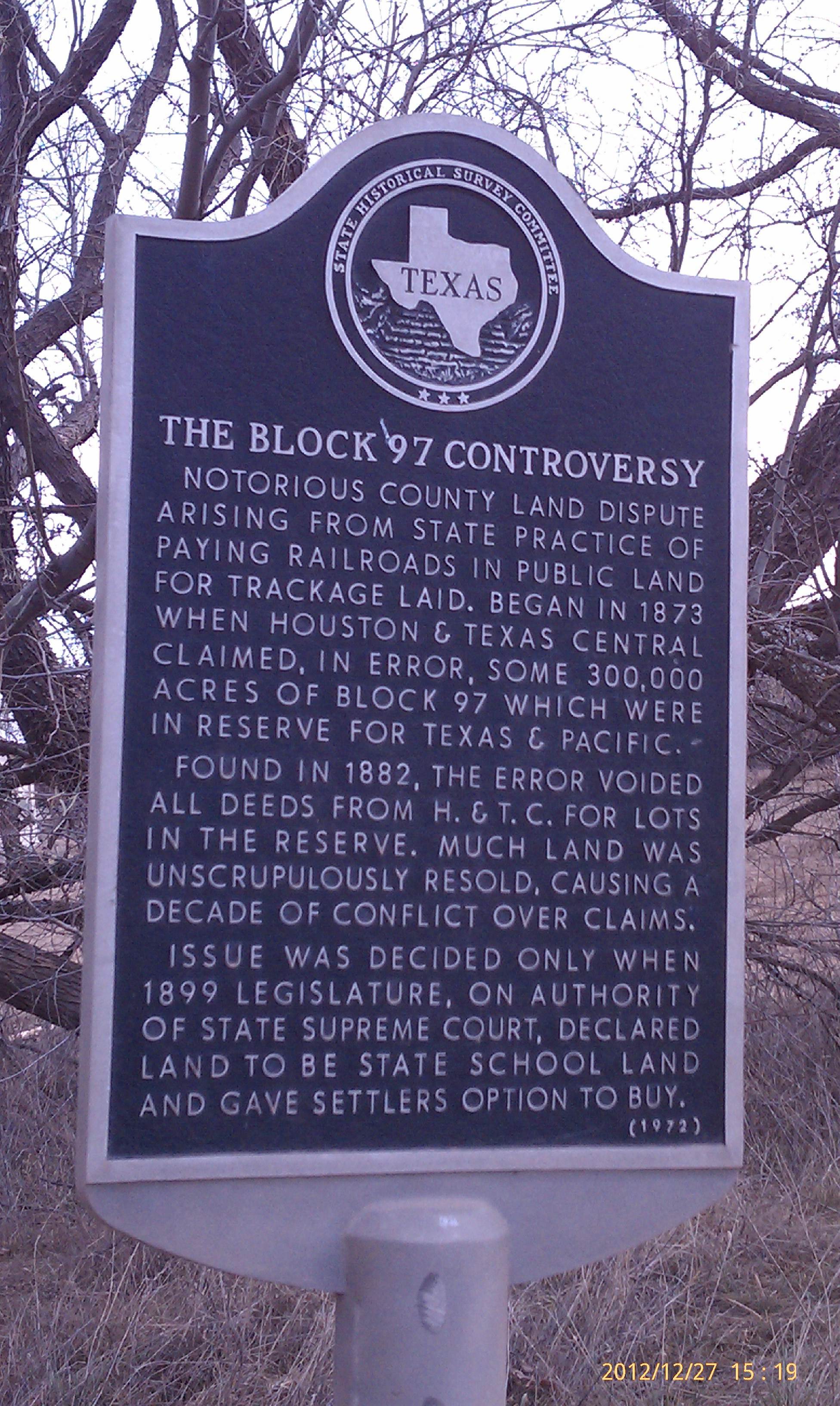 Block 97 Controversy Date: March 31, 2013Author: Museum Curator Category: Historic Tags: historic marker, Texas Post navigation World’s Largest Jackrabbit → Historic marker for the Block 97 Controversy 32.72829 -100.99709 Historic marker for the Block 97 Controversy. Where is this? Share this: Click to share on X (Opens in new window) X Click to share on Facebook (Opens in new window) Facebook Click to share on Pinterest (Opens in new window) Pinterest Click to share on Tumblr (Opens in new window) Tumblr Click to email a link to a friend (Opens in new window) Email Like Loading... Related
