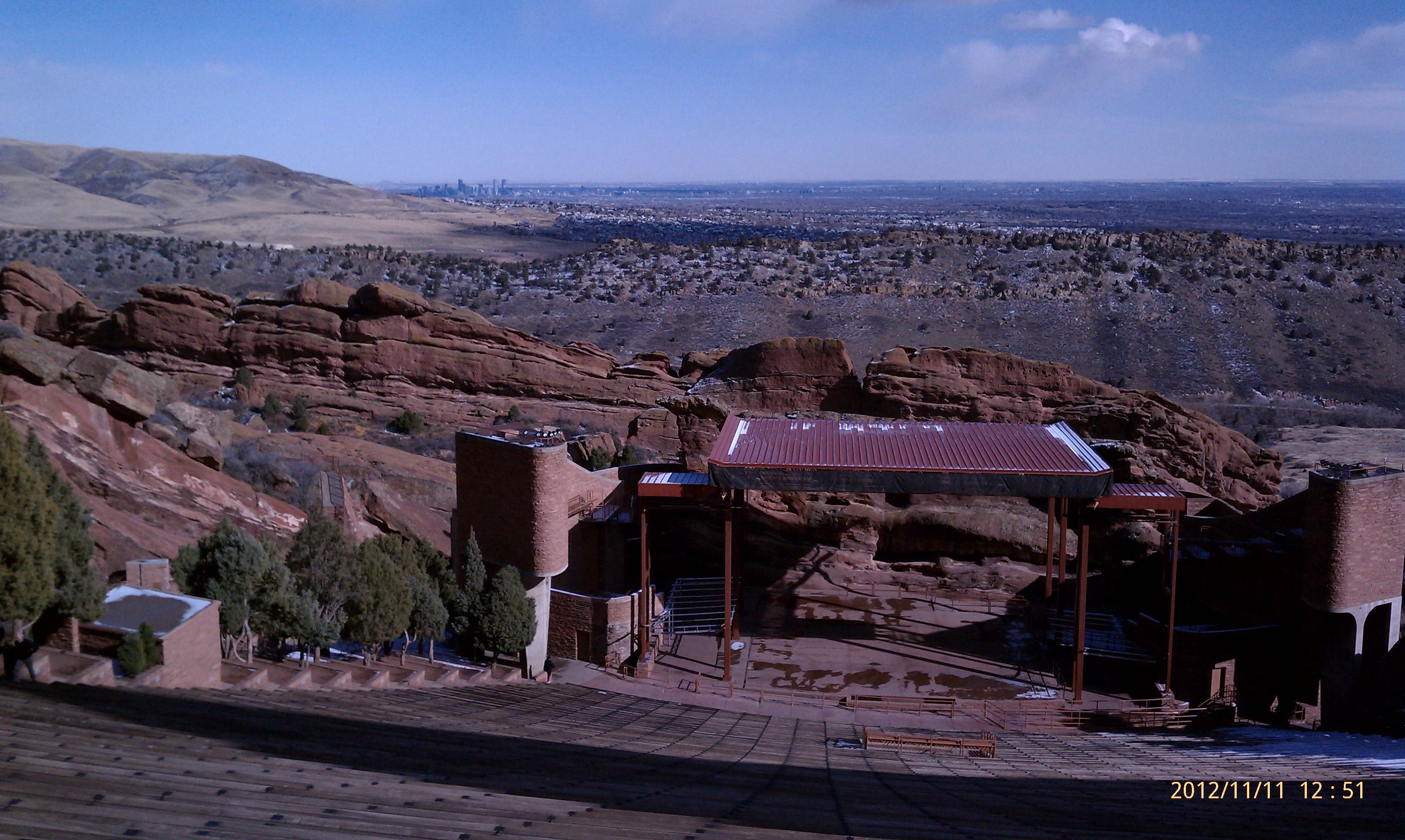 Top row of the amphitheatre at Red Rocks. Awesome view today all the way to downtown Denver and beyond.