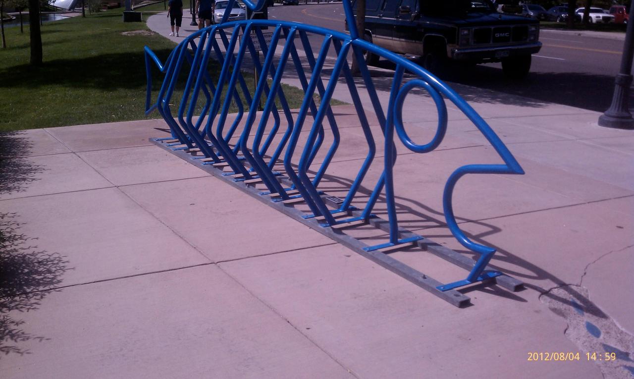 Chain up to a blue gill… Date: April 28, 2013Author: Museum Curator Category: Transportation Tags: bike rack, fish, functional art Post navigation ← Now that’s a rock face… An arrow at dusk… → 38.263725 -104.608696 Another big blue fish bike rack. Where is this? Art has many uses. Share this: Share on X (Opens in new window) X Share on Facebook (Opens in new window) Facebook Share on Pinterest (Opens in new window) Pinterest Share on Tumblr (Opens in new window) Tumblr Email a link to a friend (Opens in new window) Email Like Loading... Related