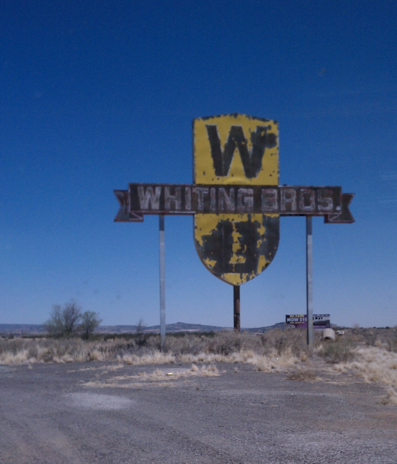 Signs of yesterday still mark the road… Date: May 6, 2013Author: Museum Curator Category: Historic Tags: art, Route 66, signs, vintage ad Post navigation ← Rock, but no roll… Destruction, then beauty… → 35.07718 -107.64573 Old sign for Whiting Brothers service station from long ago. Where is this? Another artifact of Route 66. Share this: Click to share on X (Opens in new window) X Click to share on Facebook (Opens in new window) Facebook Click to share on Pinterest (Opens in new window) Pinterest Click to share on Tumblr (Opens in new window) Tumblr Click to email a link to a friend (Opens in new window) Email Like Loading... Related