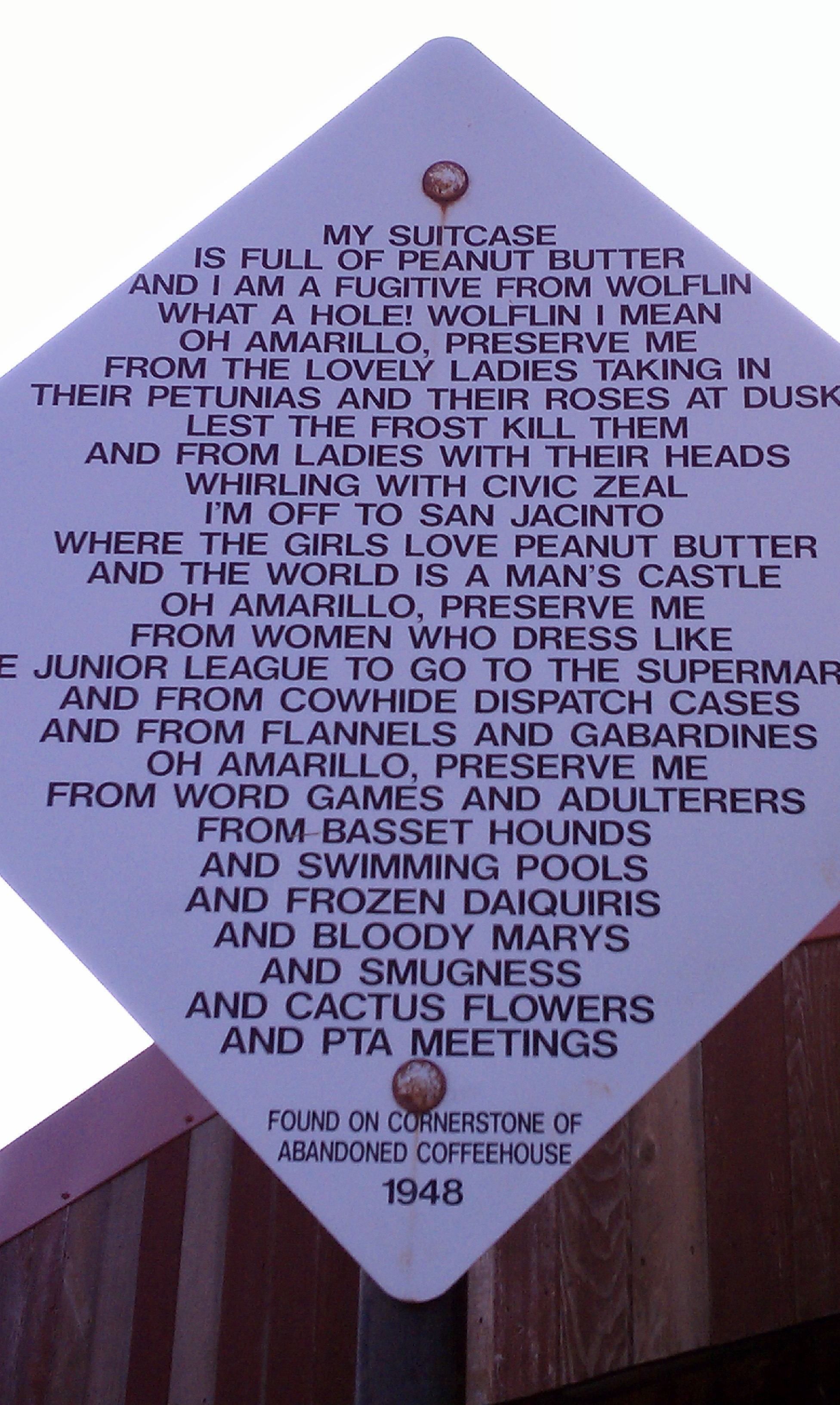 Of peanut butter and Amarillo… Date: May 23, 2013Author: Museum Curator Category: Art Tags: art in word, Dynamite Museum, poem, poetry, signs, traffic sign, written art Post navigation ← An iron horse of yesteryear… A cowboy tribute… → 35.211235 -101.86881 Dynamite Museum piece. Long poem? Where is this? Traffic sign poetry in small type. Share this: Click to share on X (Opens in new window) X Click to share on Facebook (Opens in new window) Facebook Click to share on Pinterest (Opens in new window) Pinterest Click to share on Tumblr (Opens in new window) Tumblr Click to email a link to a friend (Opens in new window) Email Like Loading... Related