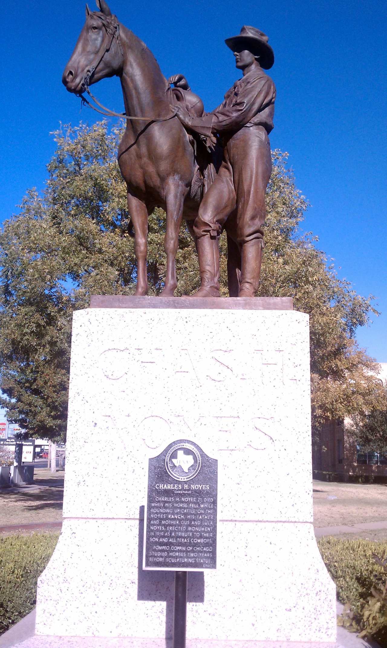 A cowboy tribute… Date: May 24, 2013Author: Museum Curator Category: Historic Tags: art, cattle roundup, cowboys, memorial, sculpture, Texas Post navigation ← Of peanut butter and Amarillo… Long hard rides on the trail… → 31.738024 -99.94706 Historic marker for Charles H. Noyes and statue. Where is this? Statue and marker is a tribute to son Charles and all Texas cowboys. Share this: Click to share on X (Opens in new window) X Click to share on Facebook (Opens in new window) Facebook Click to share on Pinterest (Opens in new window) Pinterest Click to share on Tumblr (Opens in new window) Tumblr Click to email a link to a friend (Opens in new window) Email Like Loading... Related