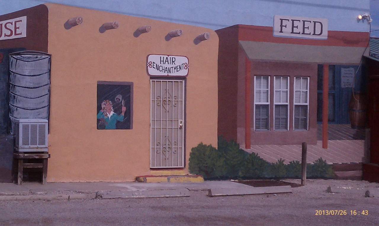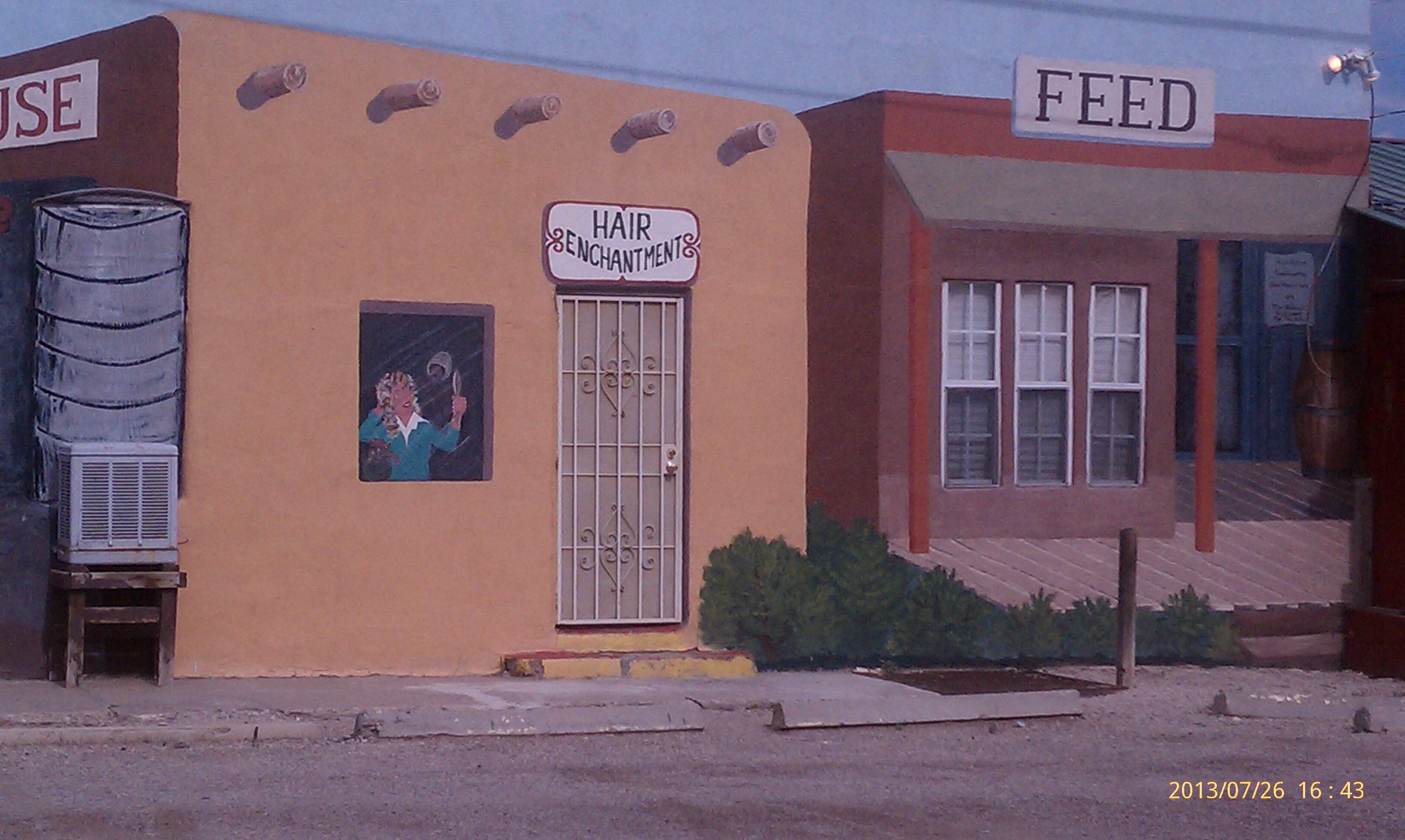 The architecture kind of looks real… Date: September 2, 2013Author: Museum Curator Category: Art Tags: feed store, hair salon, mural, store fronts Post navigation ← The neon beckons… Music to a waiting passenger’s ears… → 34.52001 -106.24176 Mural depicting store fronts of a hair salon and feed store. Where is this? Careful, they’re not real stores. Share this: Share on X (Opens in new window) X Share on Facebook (Opens in new window) Facebook Share on Pinterest (Opens in new window) Pinterest Share on Tumblr (Opens in new window) Tumblr Email a link to a friend (Opens in new window) Email Like Loading... Related