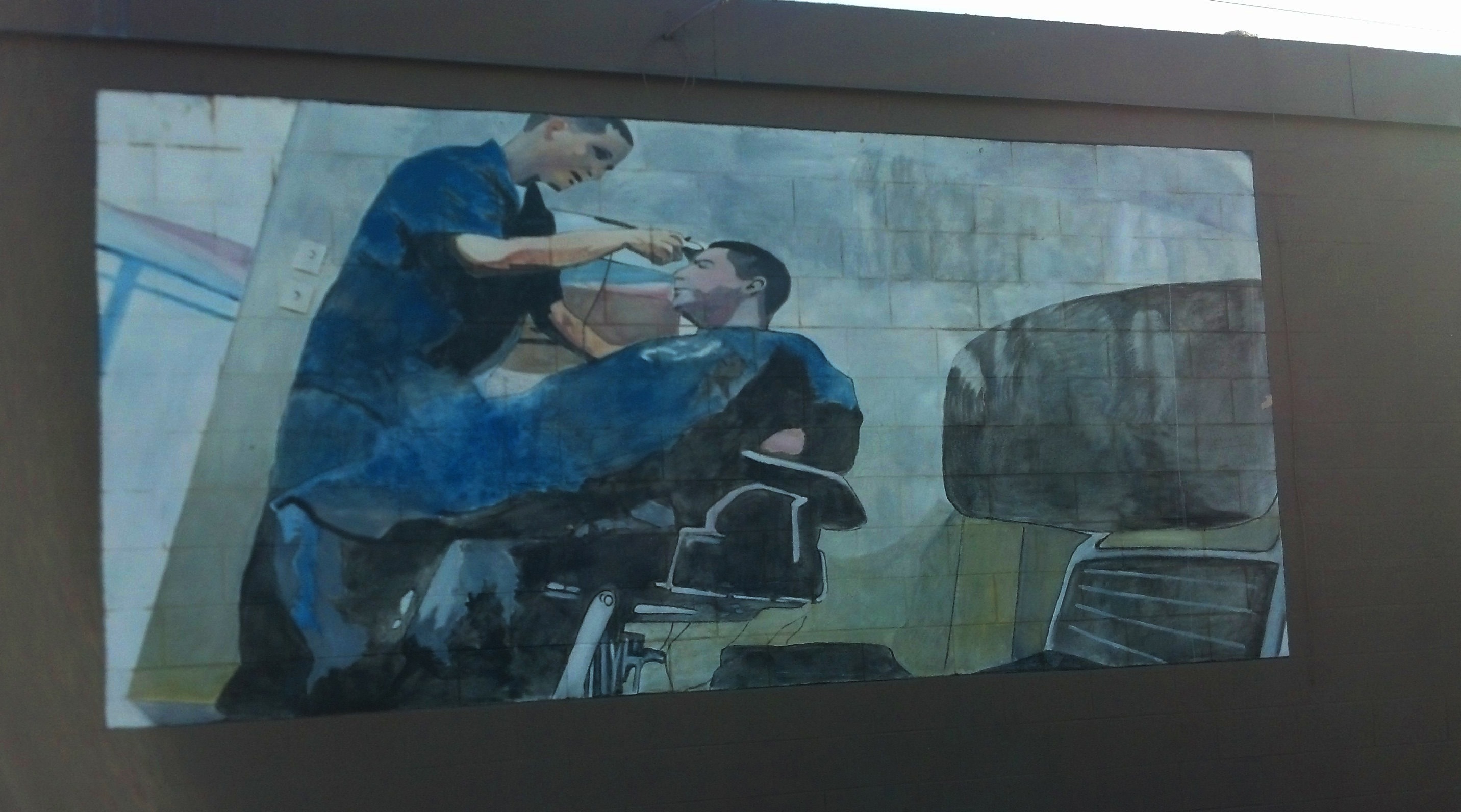 A cool mural behind this building depicting what services are provided at the establishment in front.