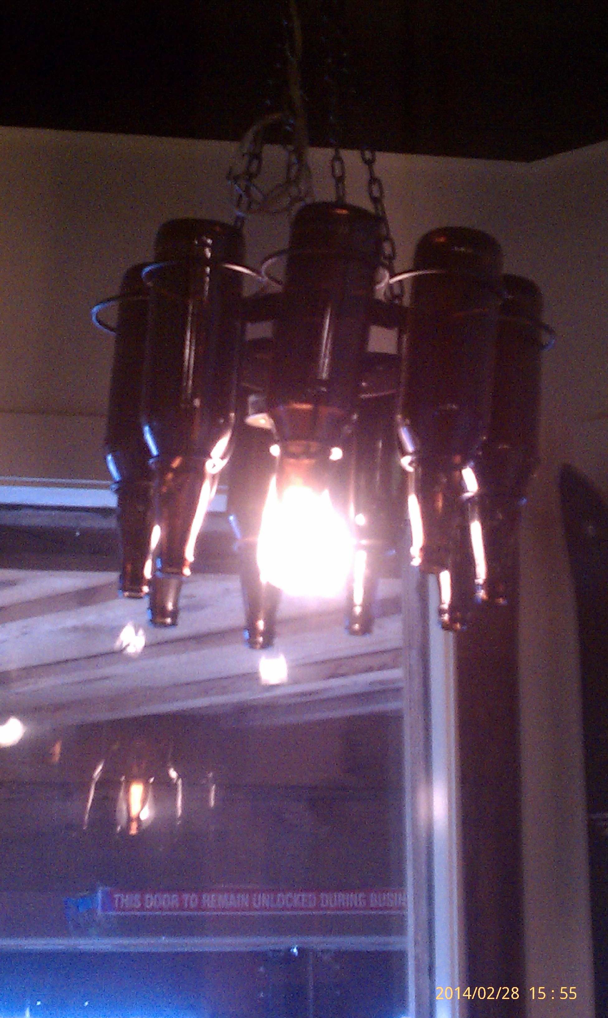 Above the table in this cubby room is a beer bomber bottle chandelier.