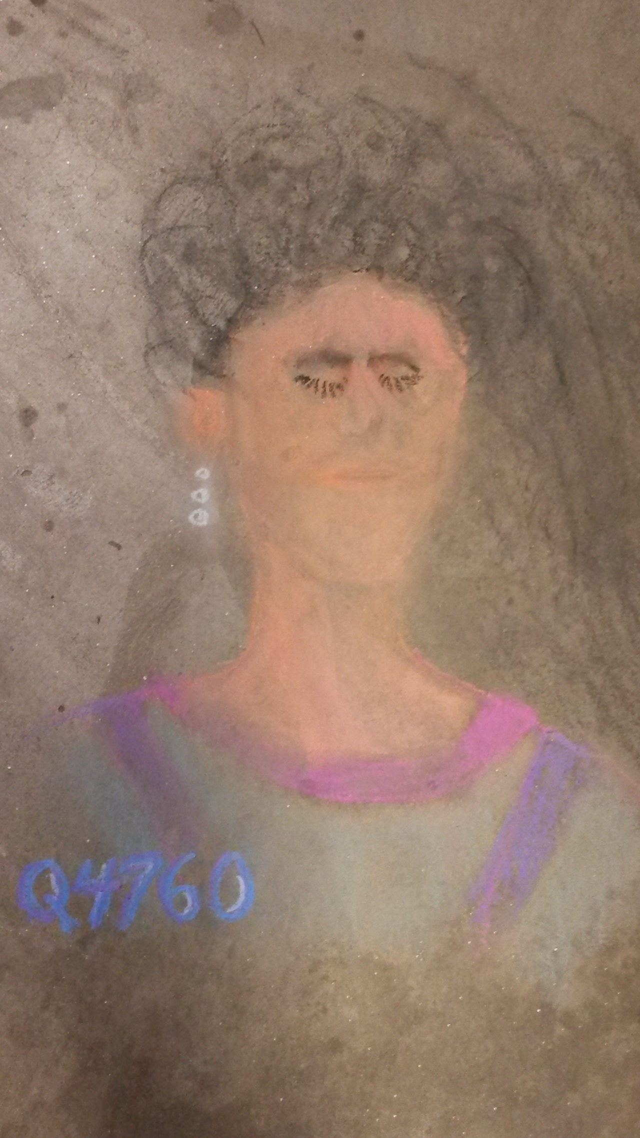 This work inspired by the above Qingxit (Q4760) is presented in three portraits. The post here also makes reference to “33.57978 -101.84488 As she prepared to make coffee, she held the espresso scoop like a fencing foil ready for competition,” Q3957. The work is chalk on concrete by S.H.R., 2014.