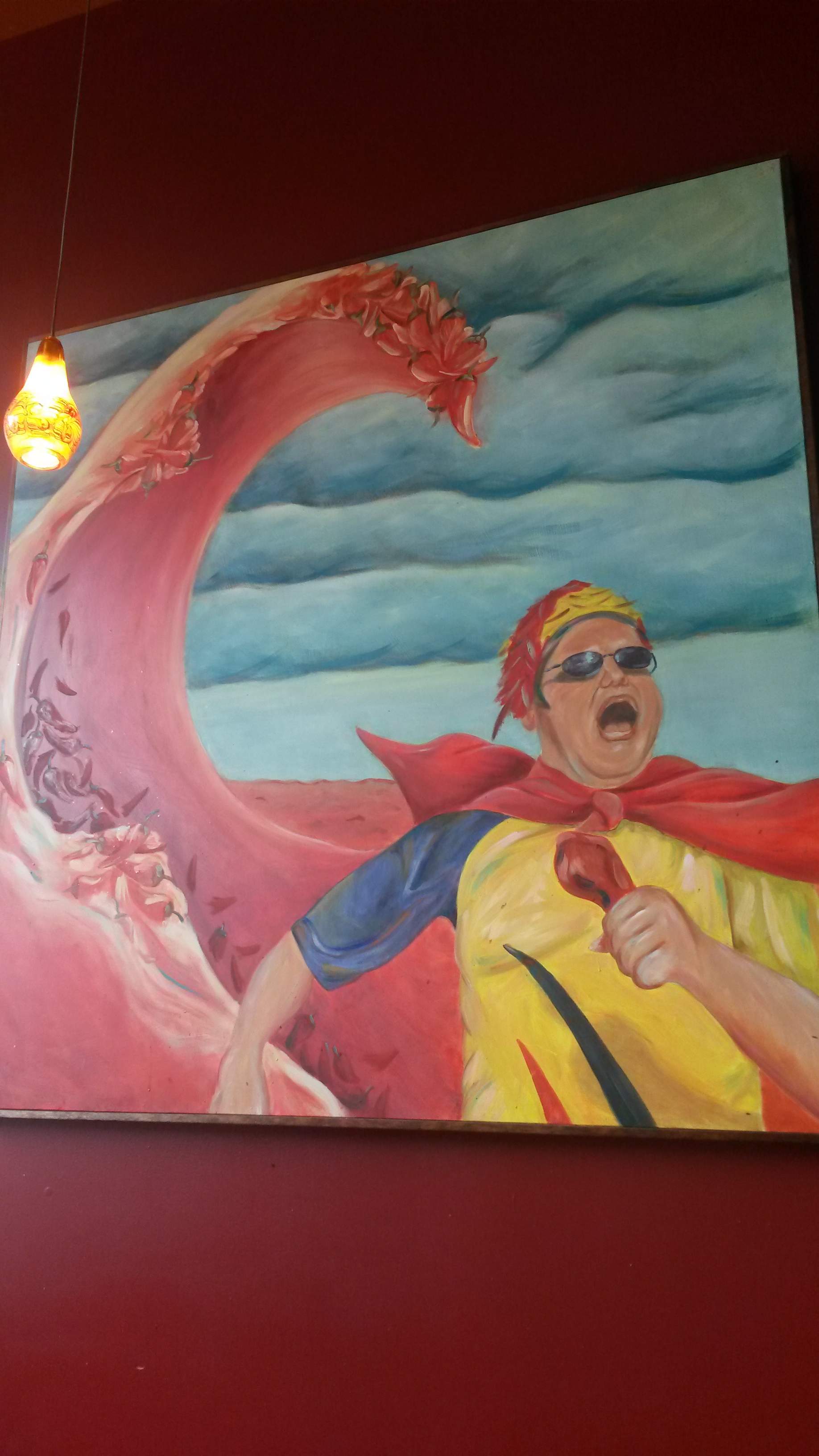 The work on this wall shows a person clutching a drumstick while running from a tidal wave of red chiles.