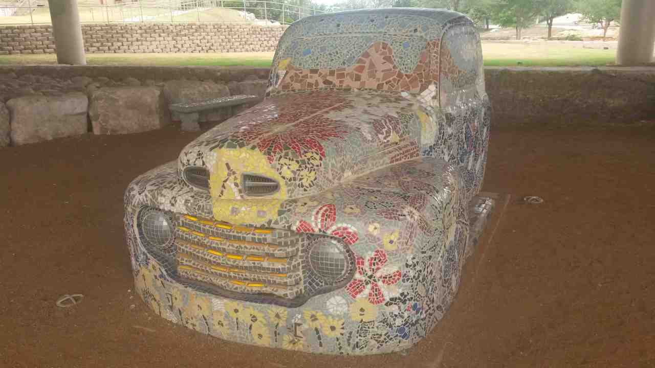 There are three tiled works under this bridge. Half a pickup truck, half a VW bug, and a complete VW bug.