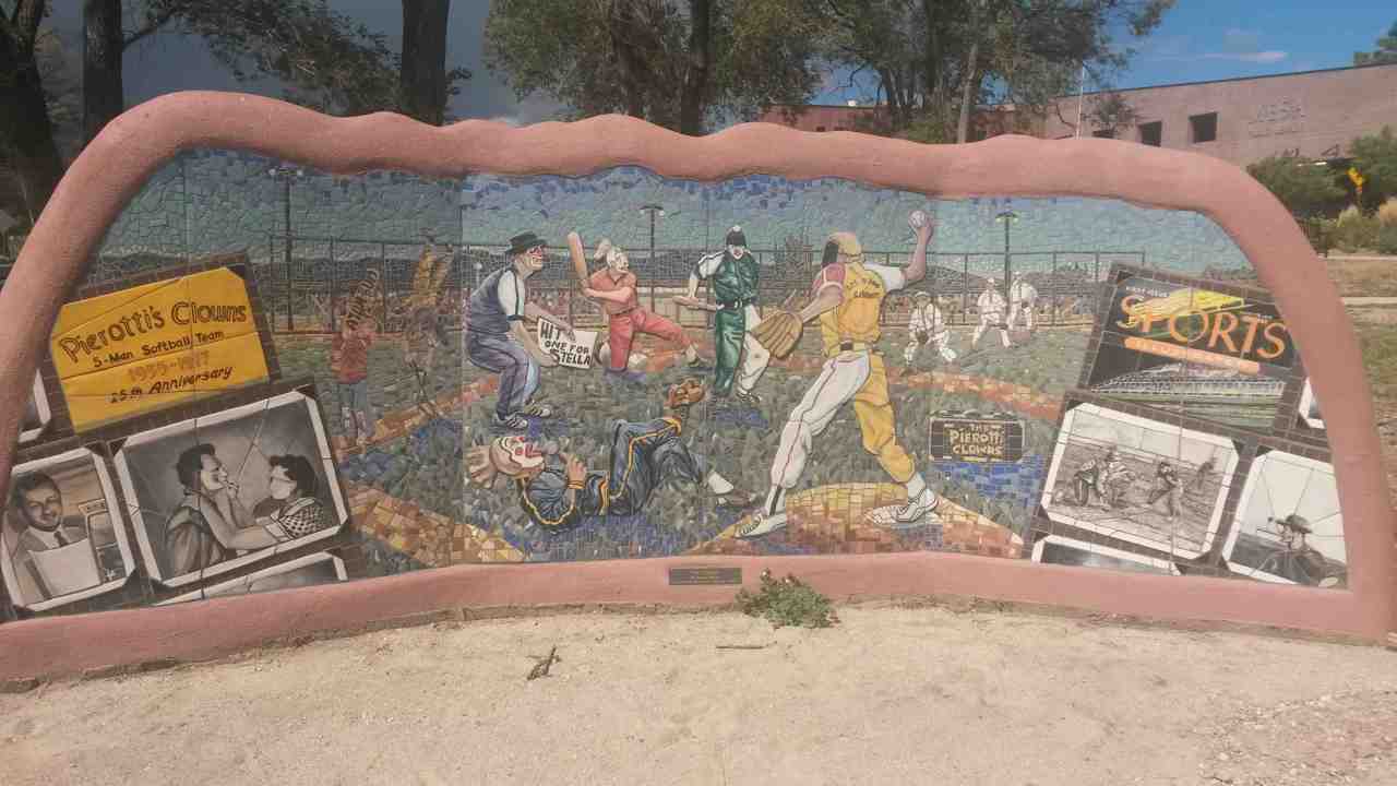 Mosaic depicting Pierotti’s Clowns five man softball team.
