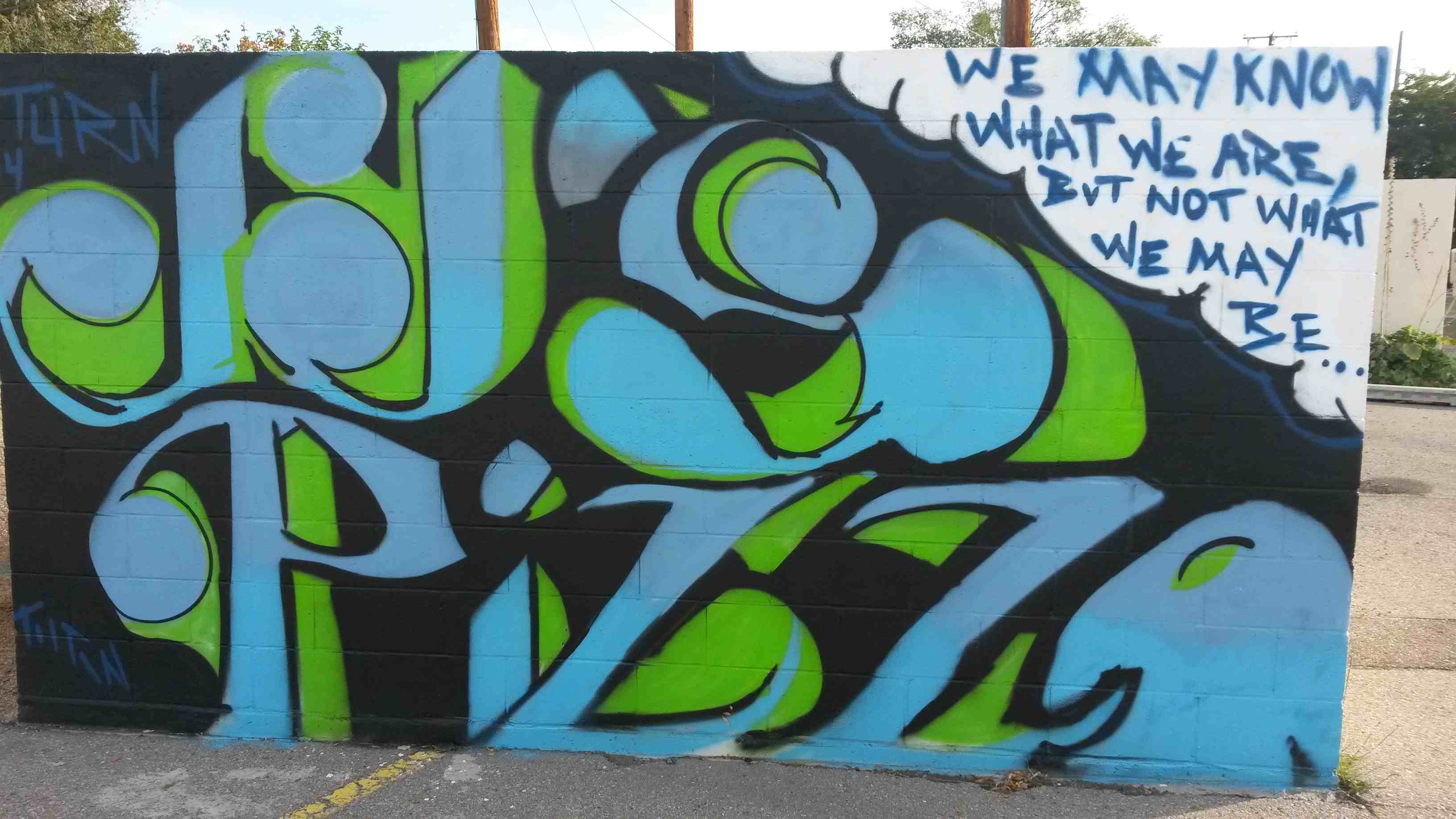 A good use of empty wall space on JJs pizza dumpster enclosure.