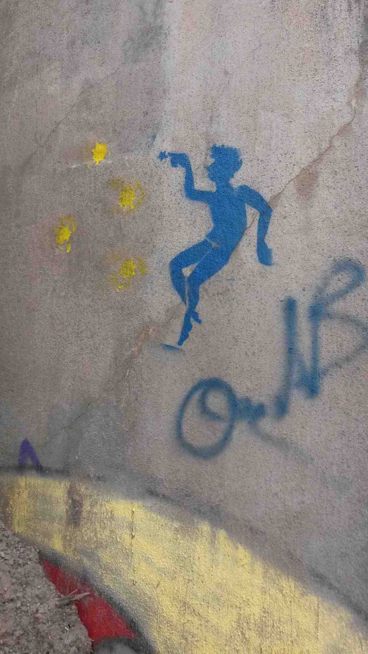 A cheshire cat, hanging man, dancing man and a bear painted here.