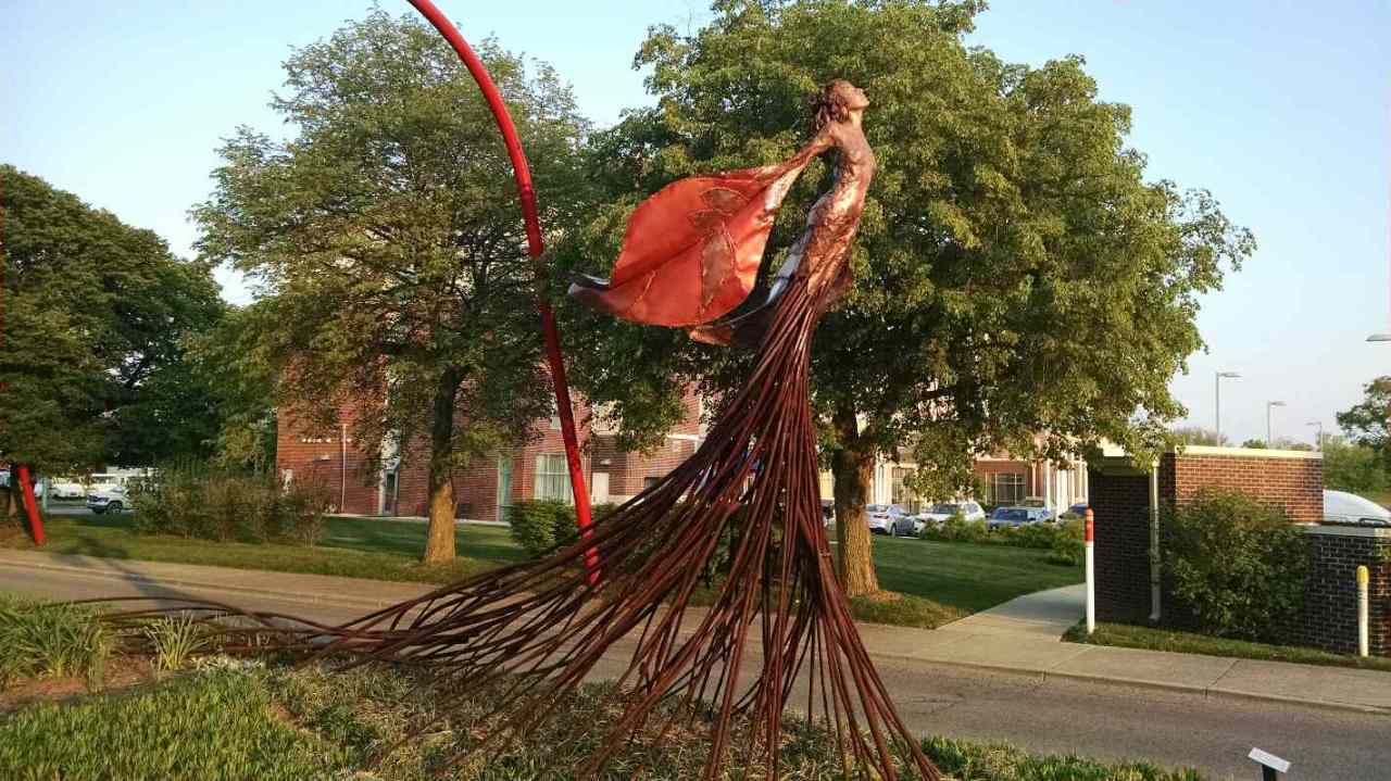 Beautiful woman made of copper arcs her chest forward, her hands like wings, and the tail of her dress struggles to keep up