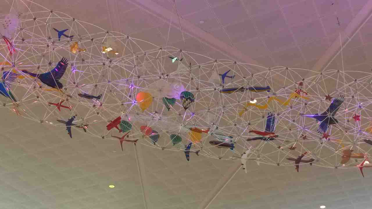 Art piece overhead shows many flying objects flowing in a rather turbulent ring.