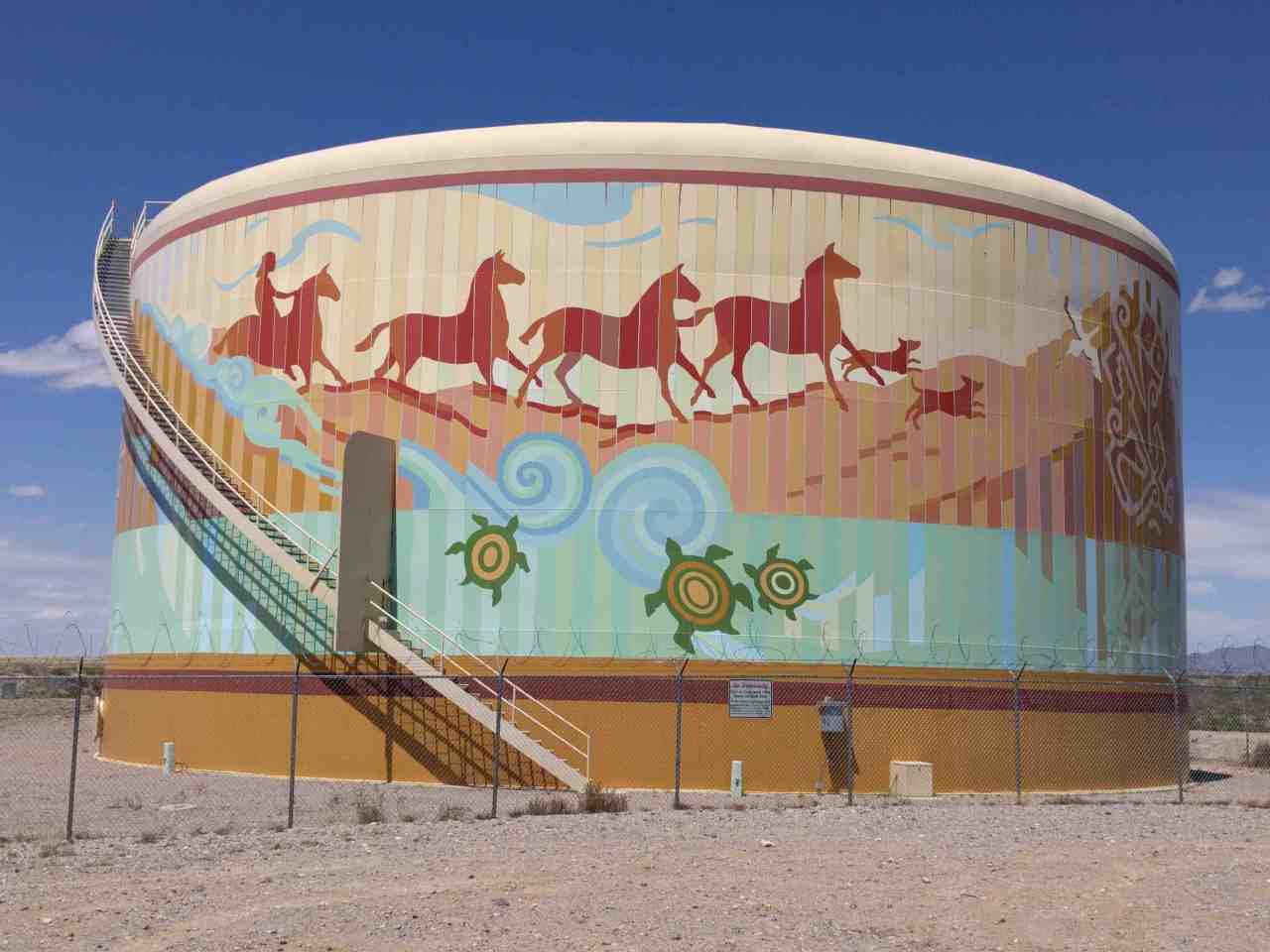 Painted water tank depicting horses and other animals.