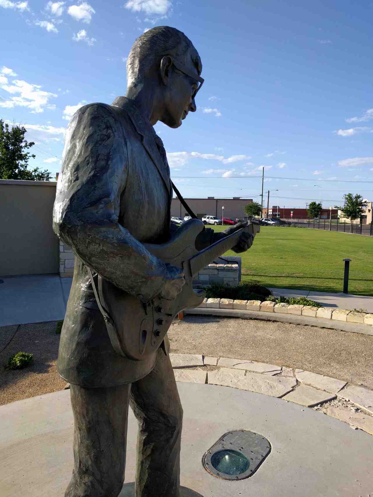 Buddy Holly stands here in bronze.