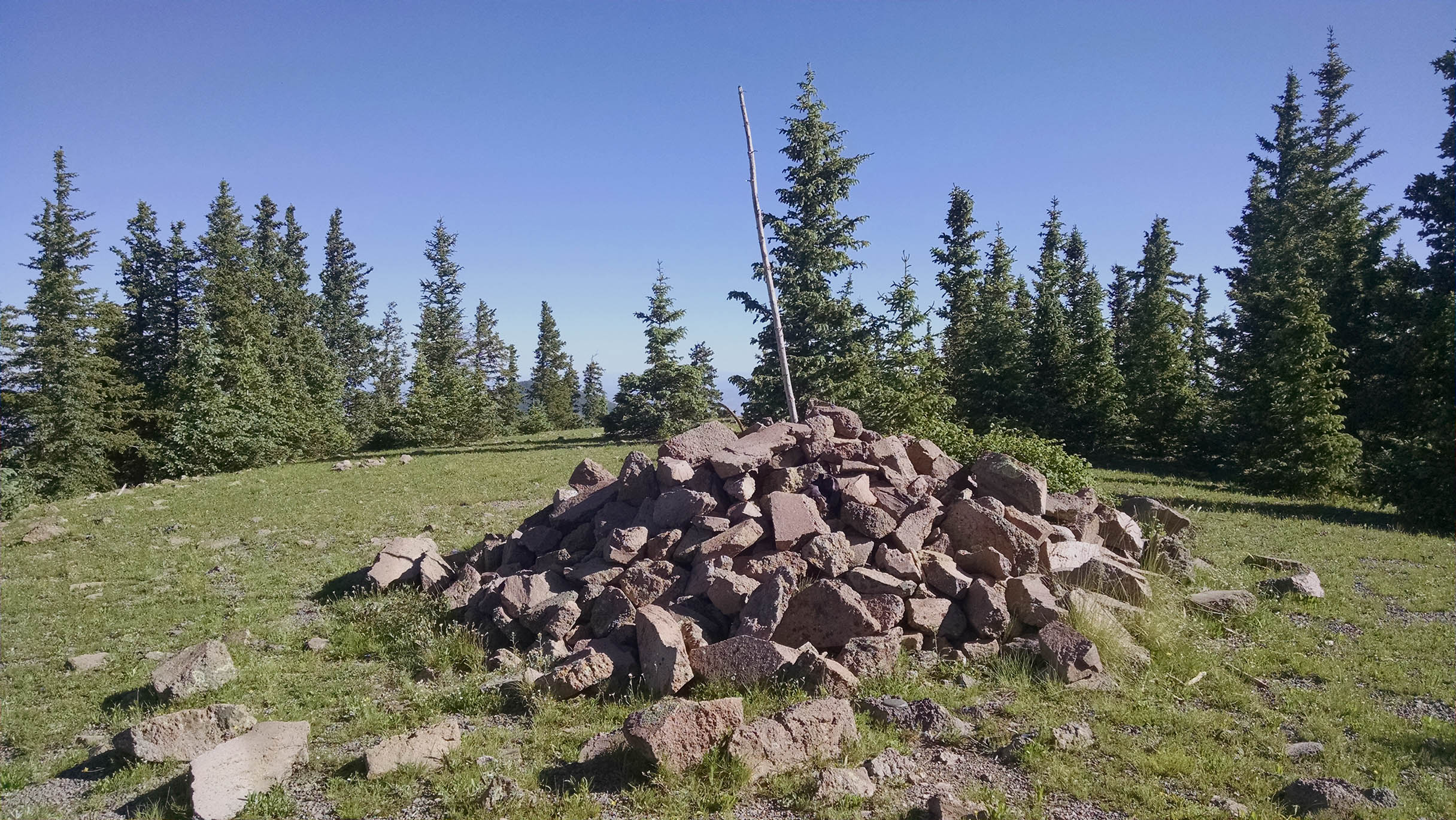 A makeshift marker & post lets hikers know they have reached the top. Kind of looks like Iwo Jima just wooded