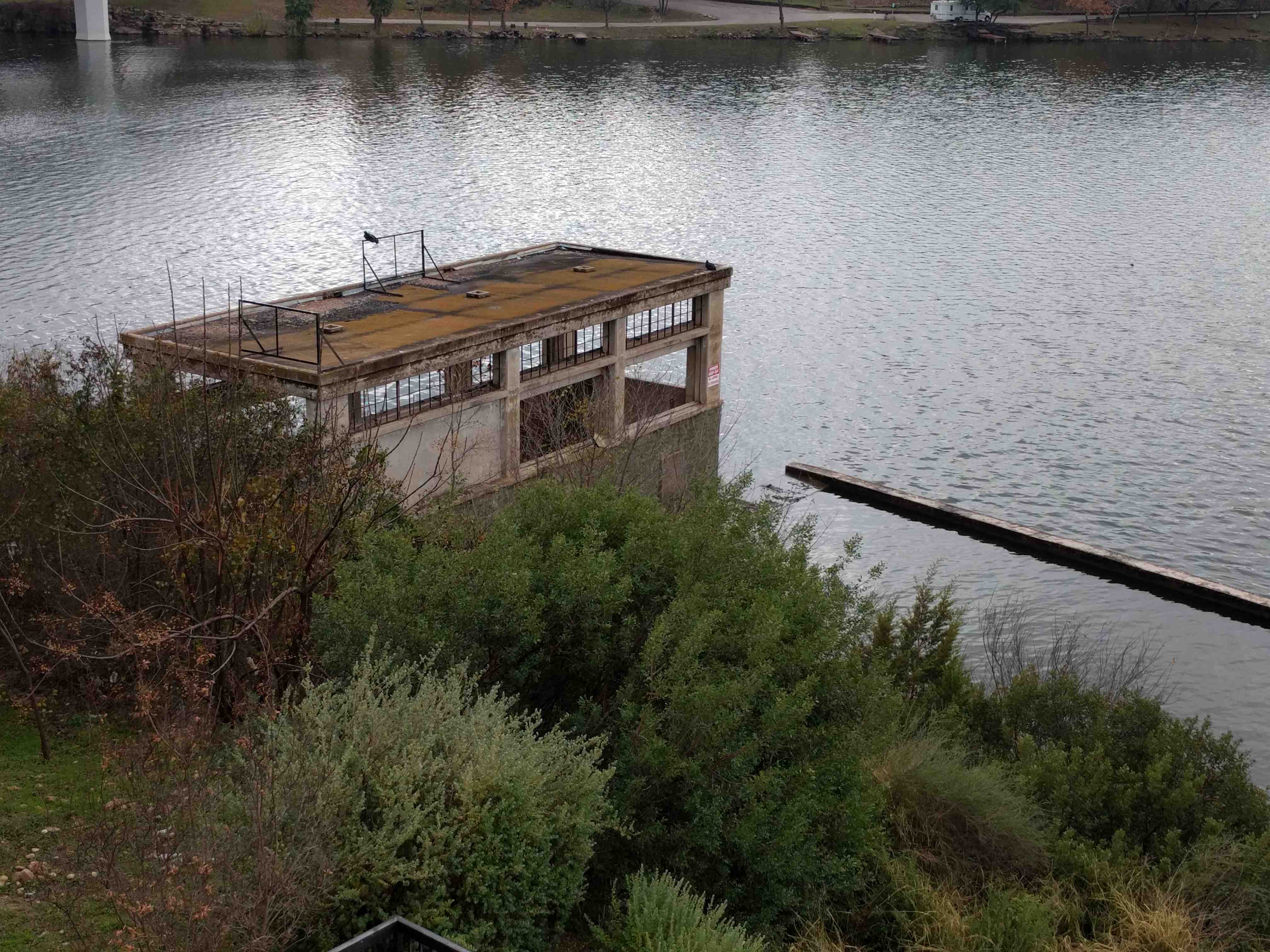 A structure for water power of the textile mill still remains below at the edge of the water.