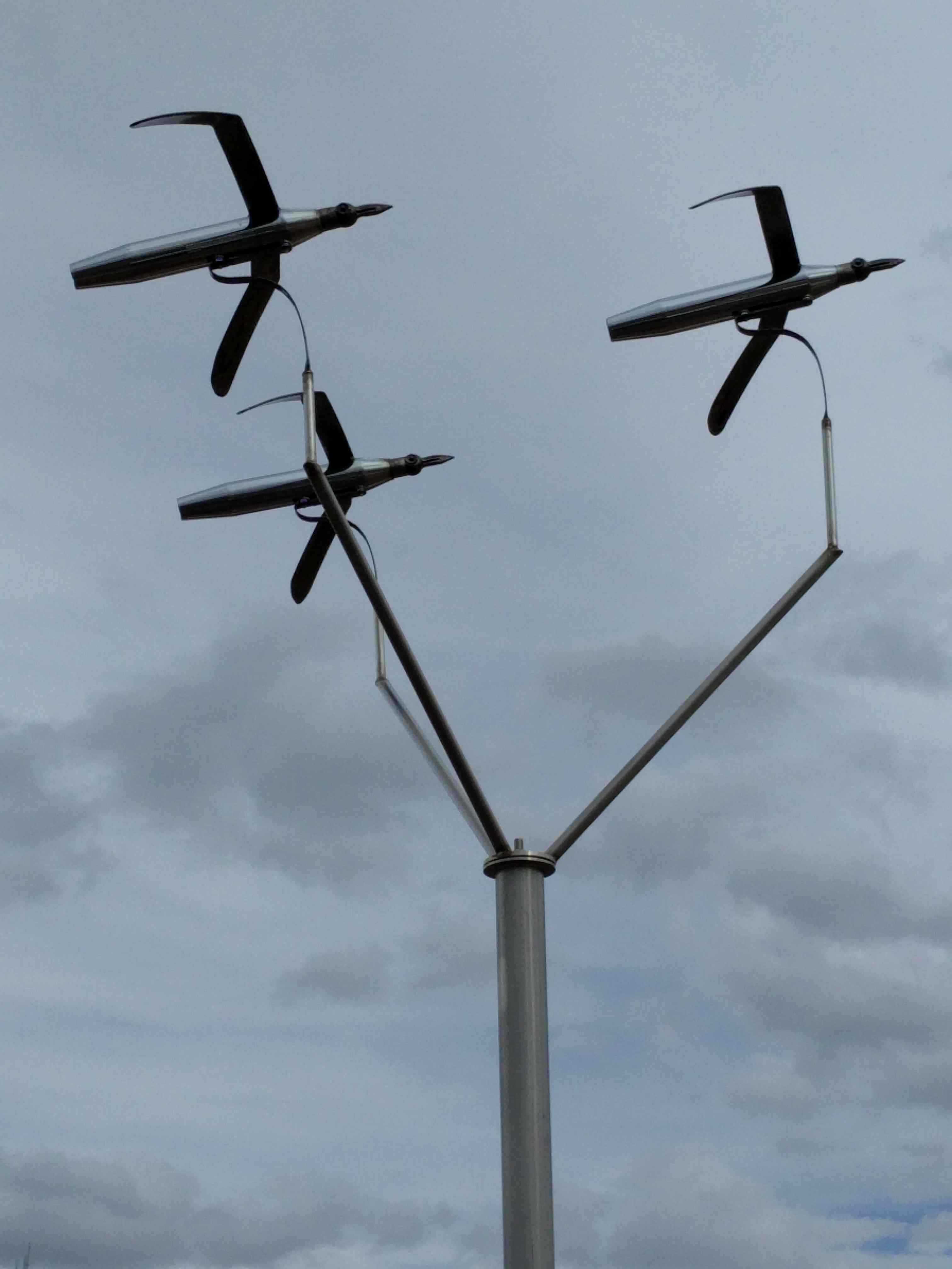 This sculpture of flying birds looks kind of like flying jets or rockets.
