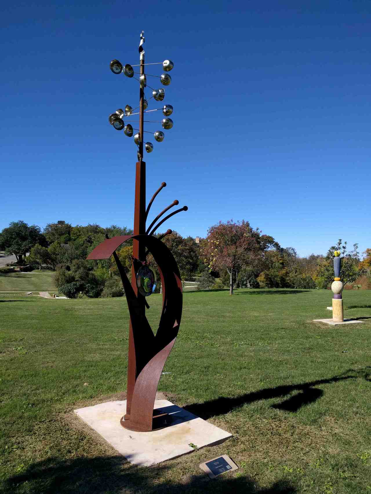 This piece is carbon steel, stainless steel, and brown glass. It is called Kinetic Beam III.