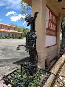 Sculpture of a sitting dog made from metal chain and machine parts.