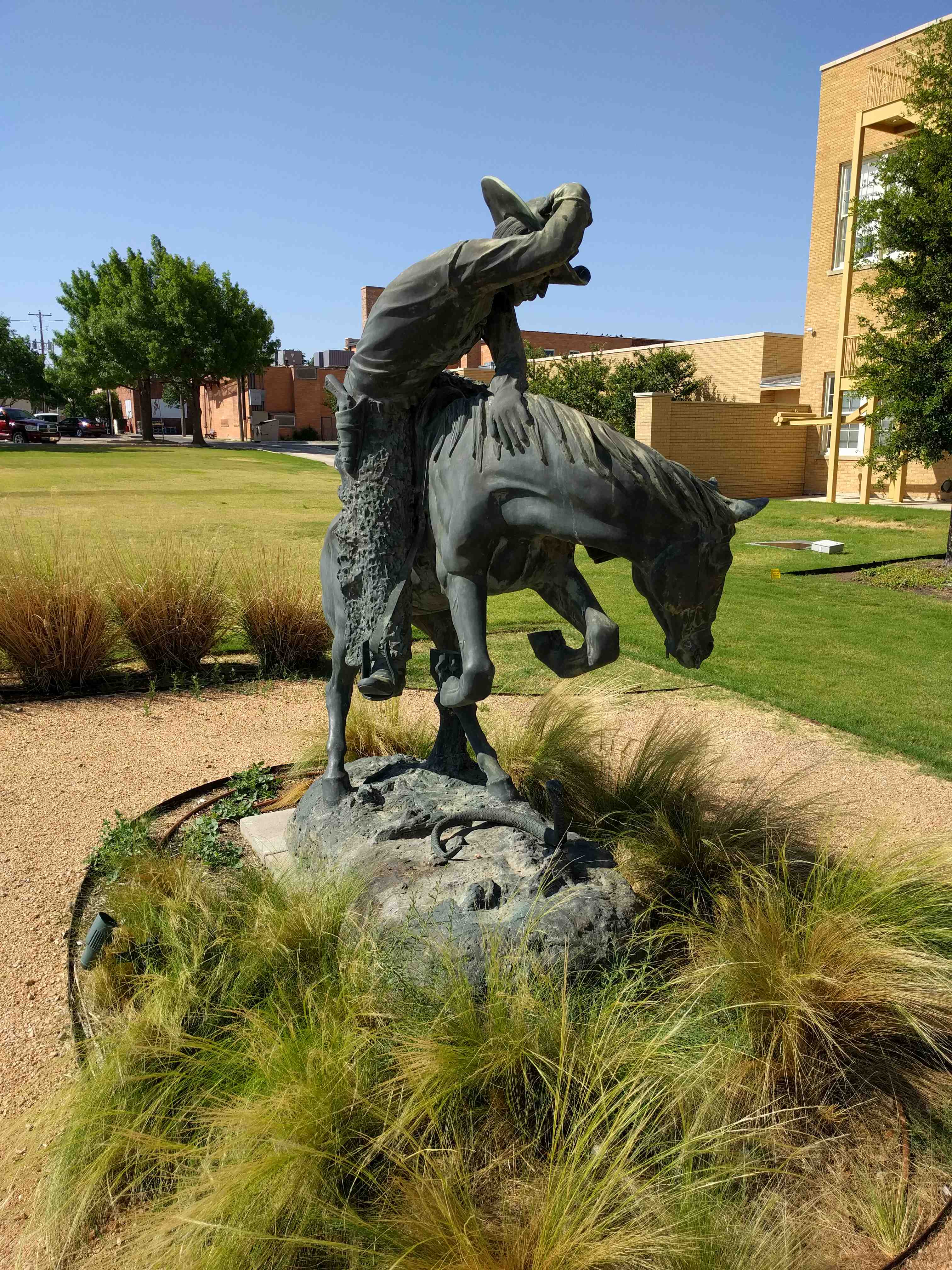 Sculpture of cowboy on horseback encountering a rattlesnake.
