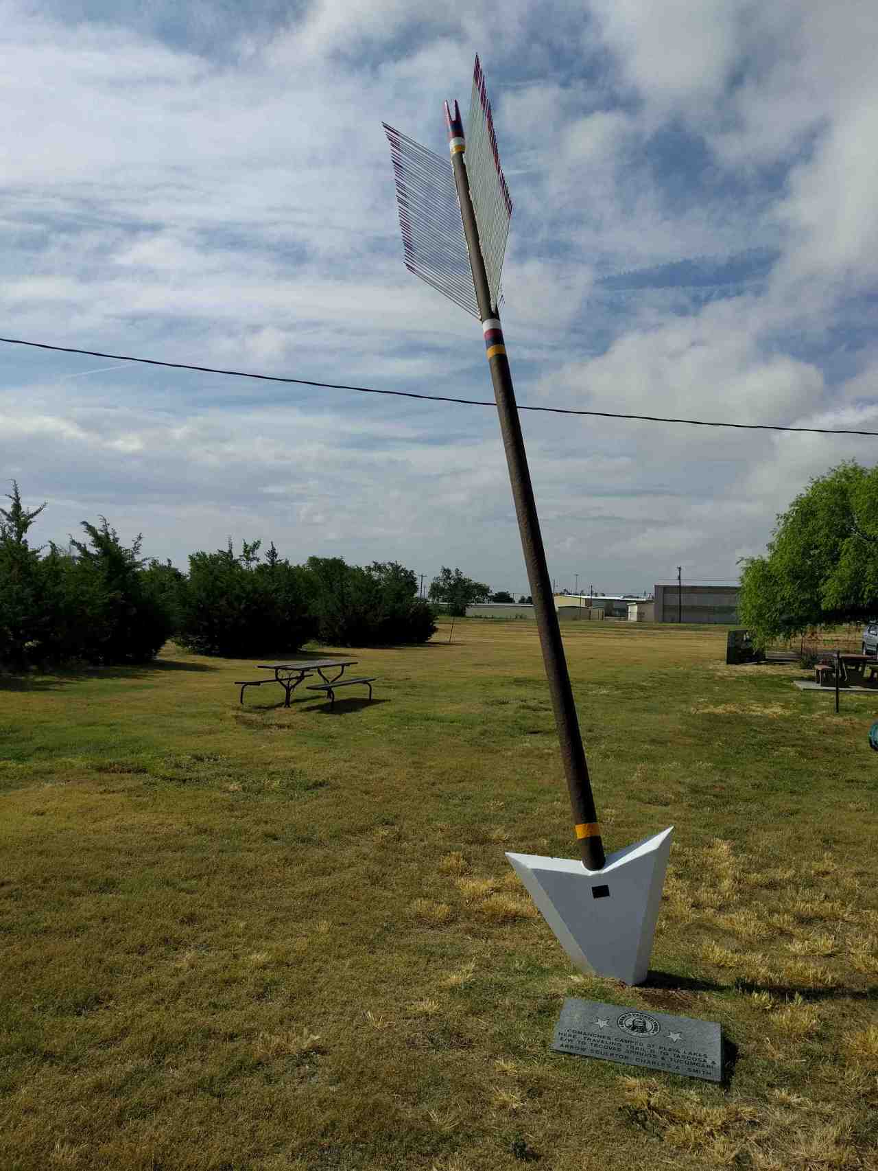 Giant arrow in the ground and monument for Quanah Parker Trail.