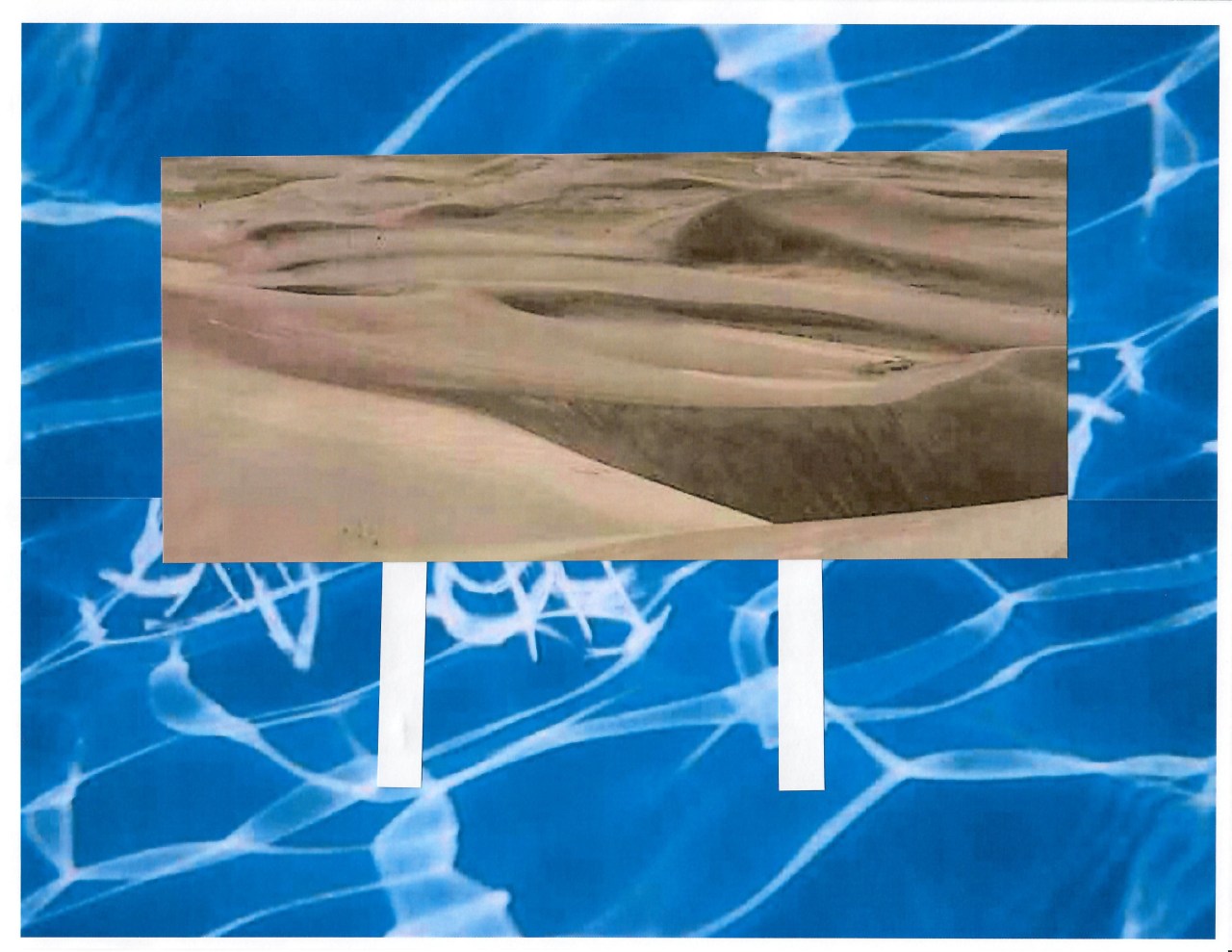 The sand sign (by S.H.R., mixed media, laser print images) was inspired by Q4683 37.764275 -105.88199 An interesting billboard in the middle of nowhere. It has no words just an image of what looks like water.