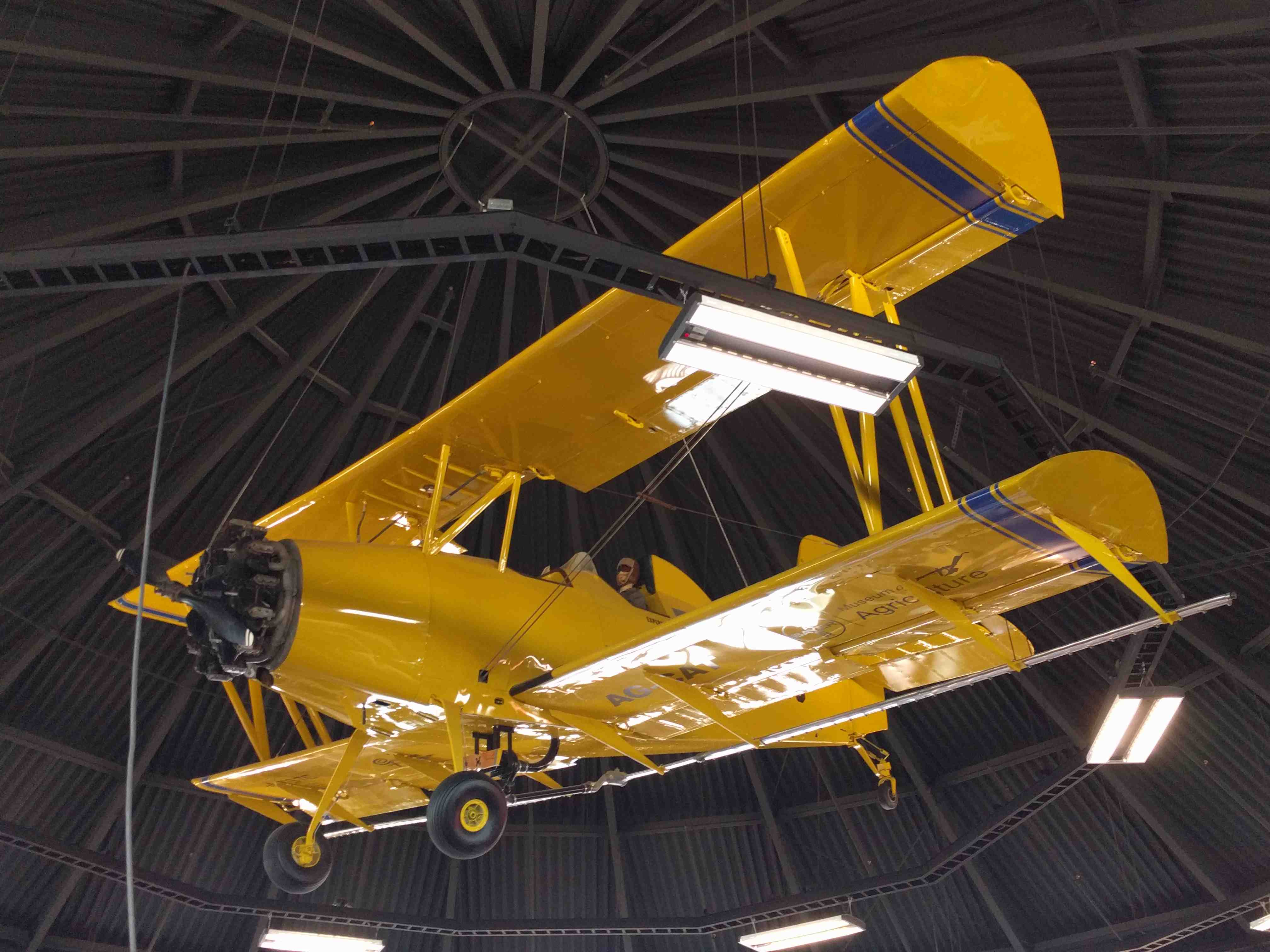 The Ag-Cat an early cropduster hangs above the museum floor.