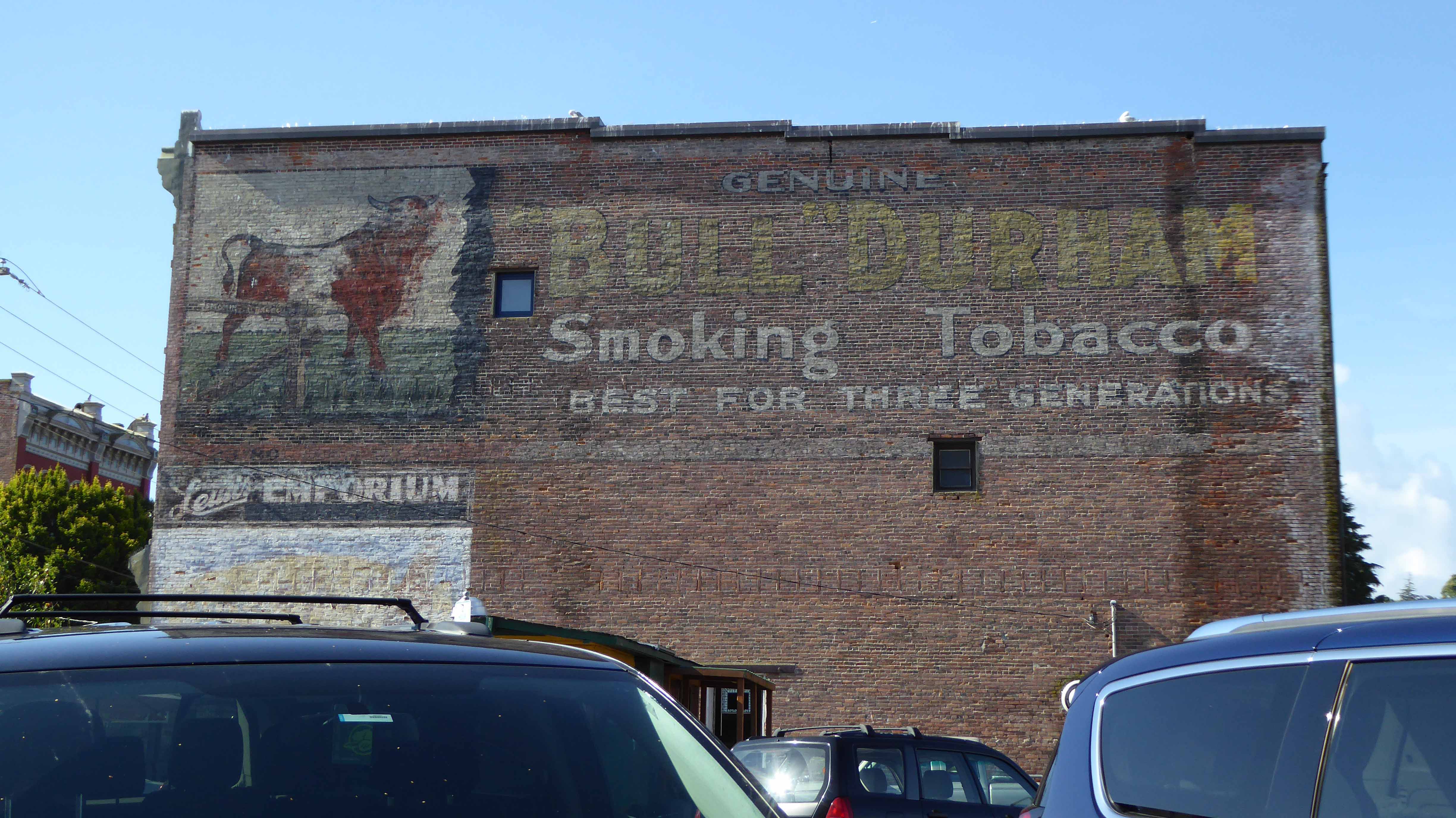 Faded ads on sides of Victorian downtowns seem to be common theme. This ad is for Bill Durham smoking tobacco.