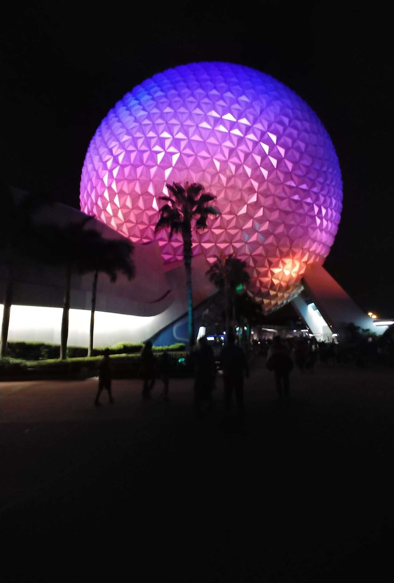 Spaceship Earth lit up at night gives it a more massive look than during the day.