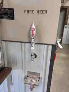The water fountain station at Bombs Away Beer Co. says ‘free beer’ and has a coors light tap.