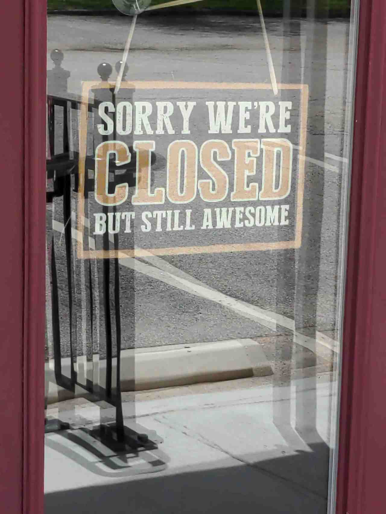 Sign on bakery door says: “Sorry we’re closed but still awesome.”
