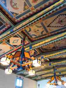 The Shaffer Hotel dining room has an ornate and eclectic ceiling.