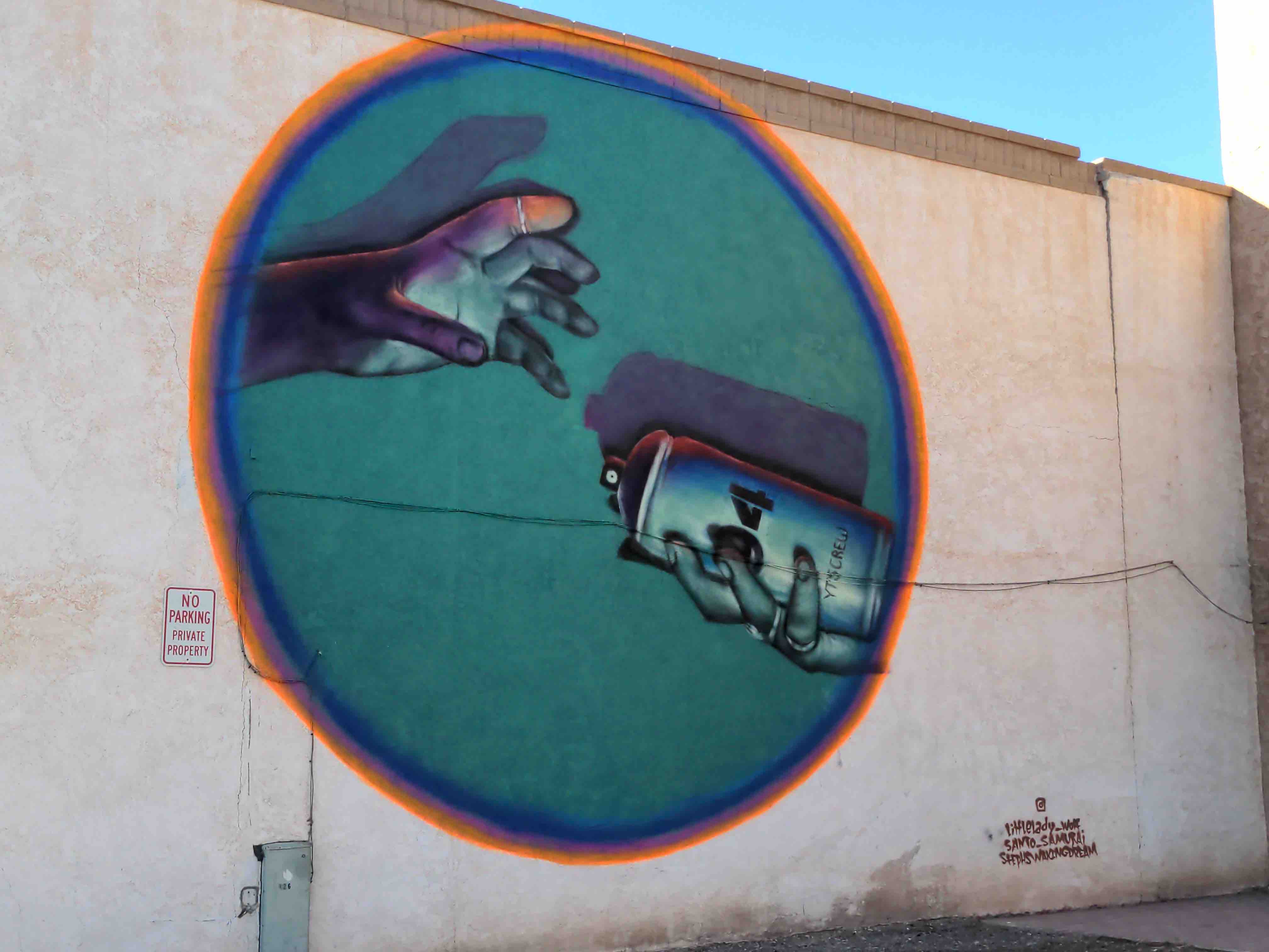 A touch of paint… Date: August 10, 2022Author: Museum Curator Category: Art Tags: an offer, art, can, connection, geotag art, hands, light, light and shadow, mural, offer, paint can, painting, reach, shadow, sign, spray paint, spray paint art, spray paint can, street art, street mural, touch Post navigation ← Seasons along a wall, part 3… Take a walk on the jazzy side… → 32.309032 -106.77907 Cool mural of hand reaching for a paint can. Show me where it is! A connection is about to be made. Share this: Click to share on X (Opens in new window) X Click to share on Facebook (Opens in new window) Facebook Click to share on Pinterest (Opens in new window) Pinterest Click to share on Tumblr (Opens in new window) Tumblr Click to email a link to a friend (Opens in new window) Email Like Loading... Related