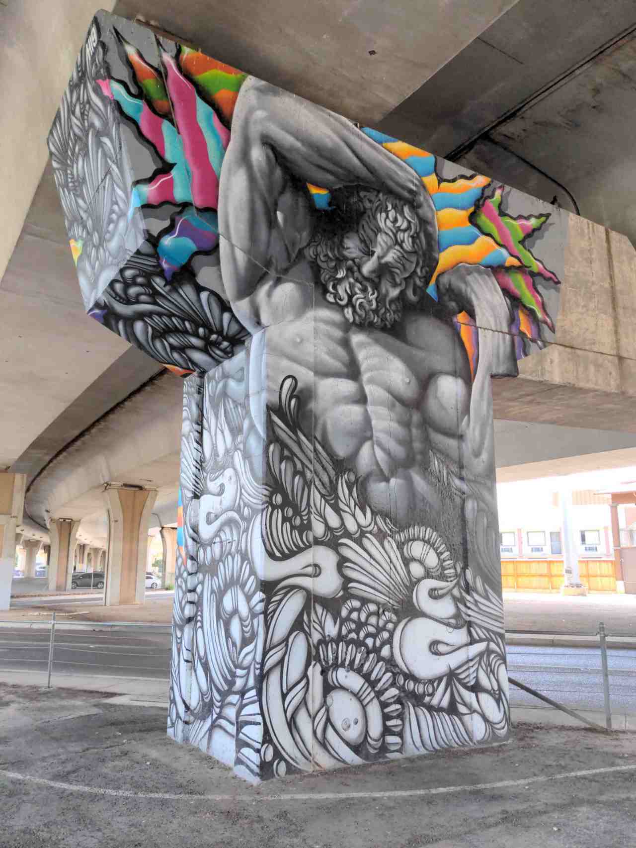 He holds up the highway… Date: December 28, 2022Author: Museum Curator Category: Art Tags: art, geotag art, graffiti, graffiti art, Greek gods, Greek mythology, Greek myths, highway art, highway concrete, highway gallery, mural, mural art, murals, ocean, painting, poseidon, sea, sign, spray paint, spray paint art, street art, street gallery Post navigation ← Every column a canvas… Strange pair… → 29.44056 -98.48445 This mural looks like a Poseidon character. Show me where it is! The gods depicted on highway concrete. Share this: Click to share on X (Opens in new window) X Click to share on Facebook (Opens in new window) Facebook Click to share on Pinterest (Opens in new window) Pinterest Click to share on Tumblr (Opens in new window) Tumblr Click to email a link to a friend (Opens in new window) Email Like Loading... Related