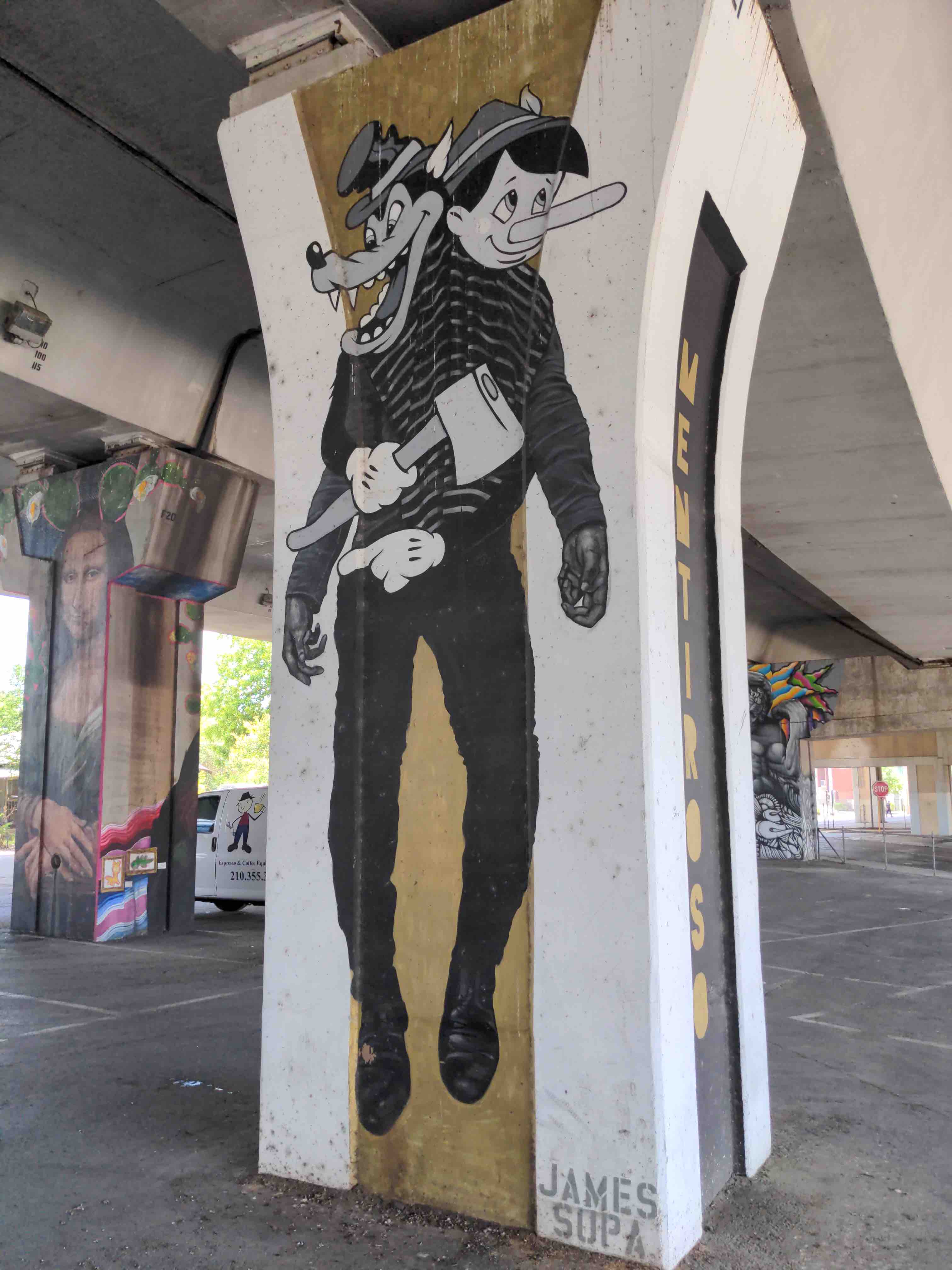 Strange pair… Date: January 4, 2023Author: Museum Curator Category: Art Tags: art, art under the overpass, bad dream, big bad wolf, fairy tale, geotag art, highway art, highway gallery, highway mural, mural, murals, nightmare, overpass, painting, pinocchio, street art, two headed, two heads, wolf Post navigation ← He holds up the highway… Try not to look… → 29.440397 -98.48488 This mural has a two-headed character. One head is the big bad wolf and the other is Pinocchio. Show me where it is! This looks like a scary fairy tale. Share this: Share on X (Opens in new window) X Share on Facebook (Opens in new window) Facebook Share on Pinterest (Opens in new window) Pinterest Share on Tumblr (Opens in new window) Tumblr Email a link to a friend (Opens in new window) Email Like Loading... Related