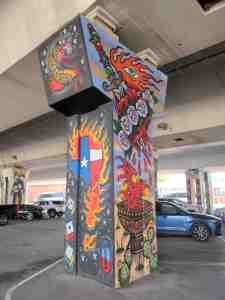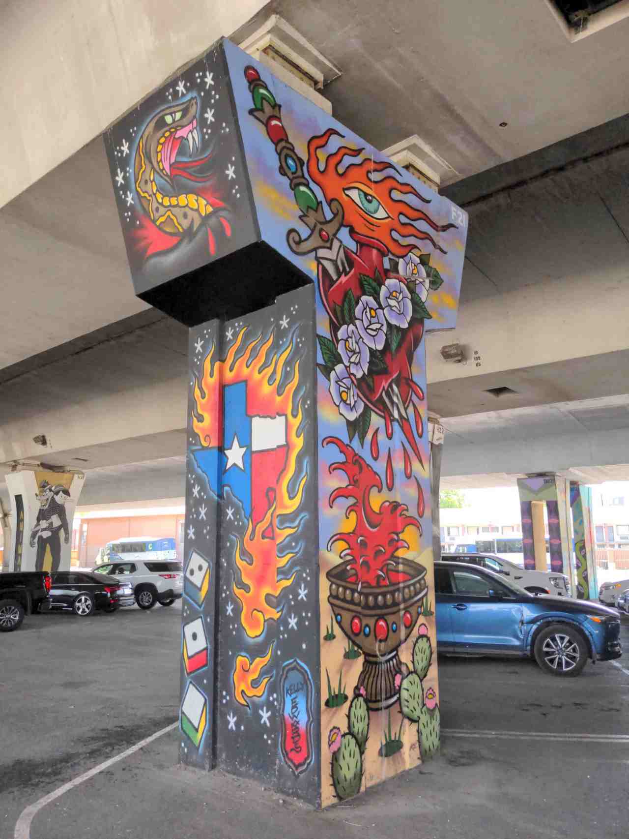 Underneath the interstate highway here is a huge gallery of murals. Each concrete column is a canvas.