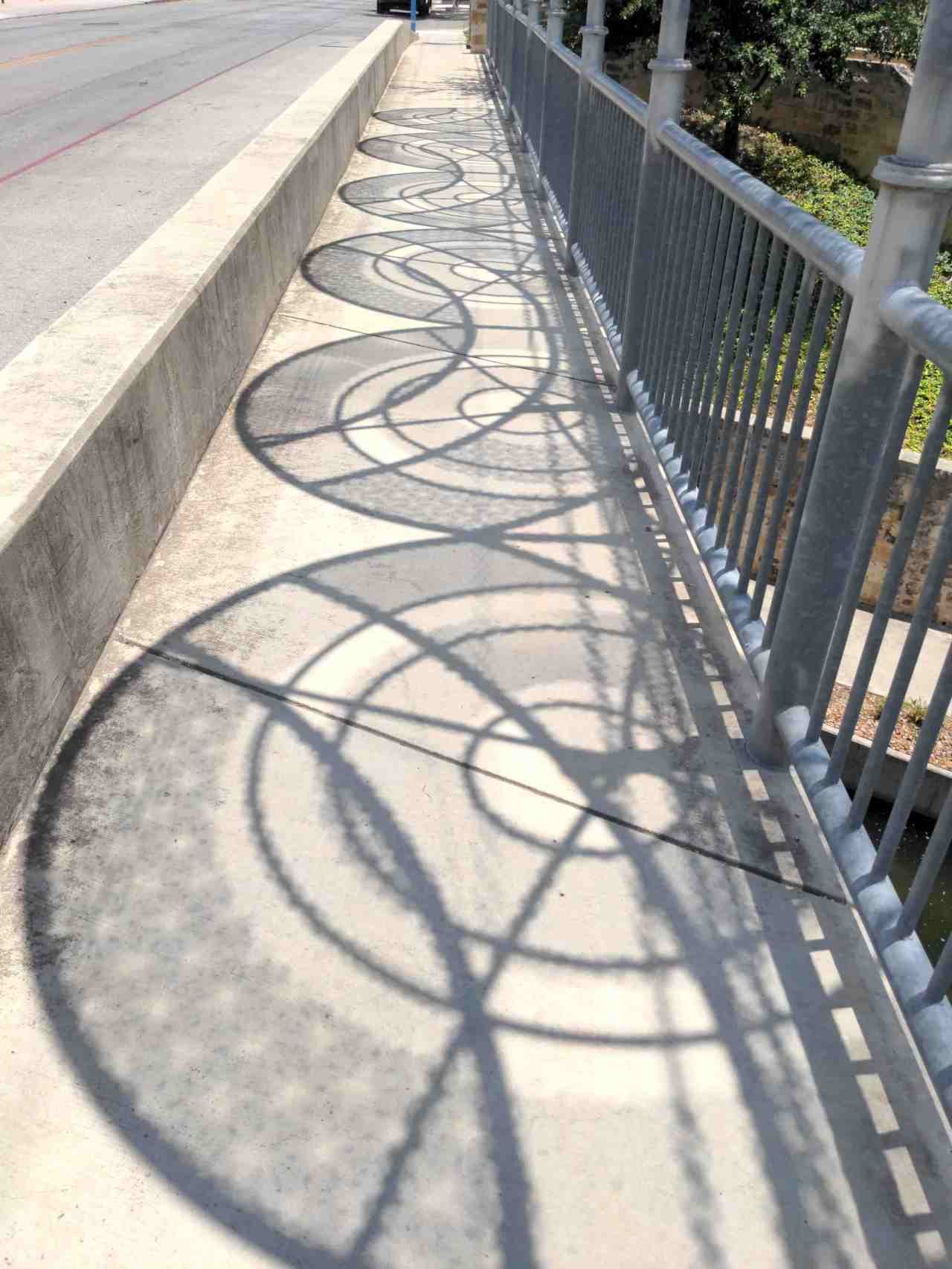 Sun and shadow… Date: April 19, 2023Author: Museum Curator Category: Art Tags: art, circles, curves, dots, geometric patterns, geometric shadows, geotag art, lines, metal, metal art, metal canopy, path, patterns, projection, shadow, shadows, sidewalk, street art, sun, tangents Post navigation ← Big butterfly… Morse code? → 29.433445 -98.4852 Metal work above creates a cool, interesting shadow on the sidewalk. Show me where it is! Art is projected on the sidewalk. Share this: Click to share on X (Opens in new window) X Click to share on Facebook (Opens in new window) Facebook Click to share on Pinterest (Opens in new window) Pinterest Click to share on Tumblr (Opens in new window) Tumblr Click to email a link to a friend (Opens in new window) Email Like Loading... Related
