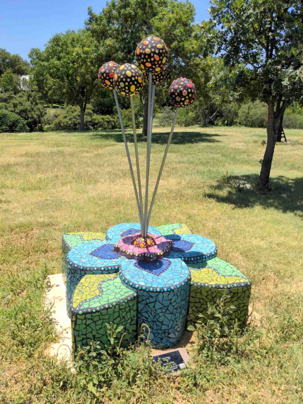 A burst of color… Date: May 24, 2023Author: Museum Curator Category: Art Tags: art, art in the park, color, color tiles, flower, flower pattern, flower power, geotag art, mosaic, mosaic sculpture, mosaic tile, sculpture, sculpture garden, tile art, tiled art Post navigation ← A bit of shiny calm… Use for giant bottles… → 31.454786 -100.442474 This piece is called Flor de Alegria. Show me where it is! A flower pattern of color. Share this: Click to share on X (Opens in new window) X Click to share on Facebook (Opens in new window) Facebook Click to share on Pinterest (Opens in new window) Pinterest Click to share on Tumblr (Opens in new window) Tumblr Click to email a link to a friend (Opens in new window) Email Like Loading... Related