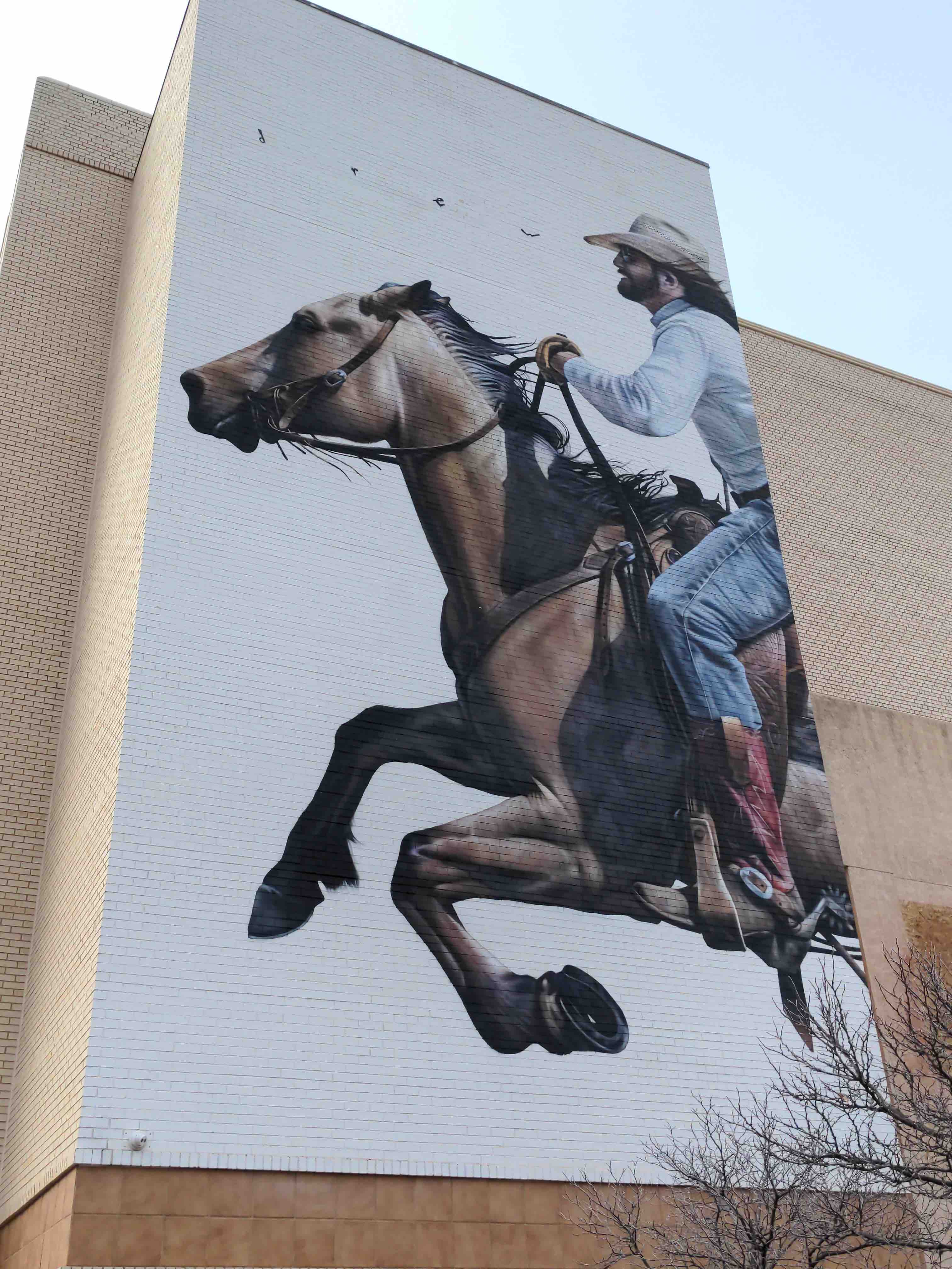 Tags: art, art space, big cowboy, big mural, building art, cowboy, fast rider, geotag art, horse, horse rider, horseman, mural, rider, tall cowboy, tall mural, tall painting, wall art, wall painting, western, western art