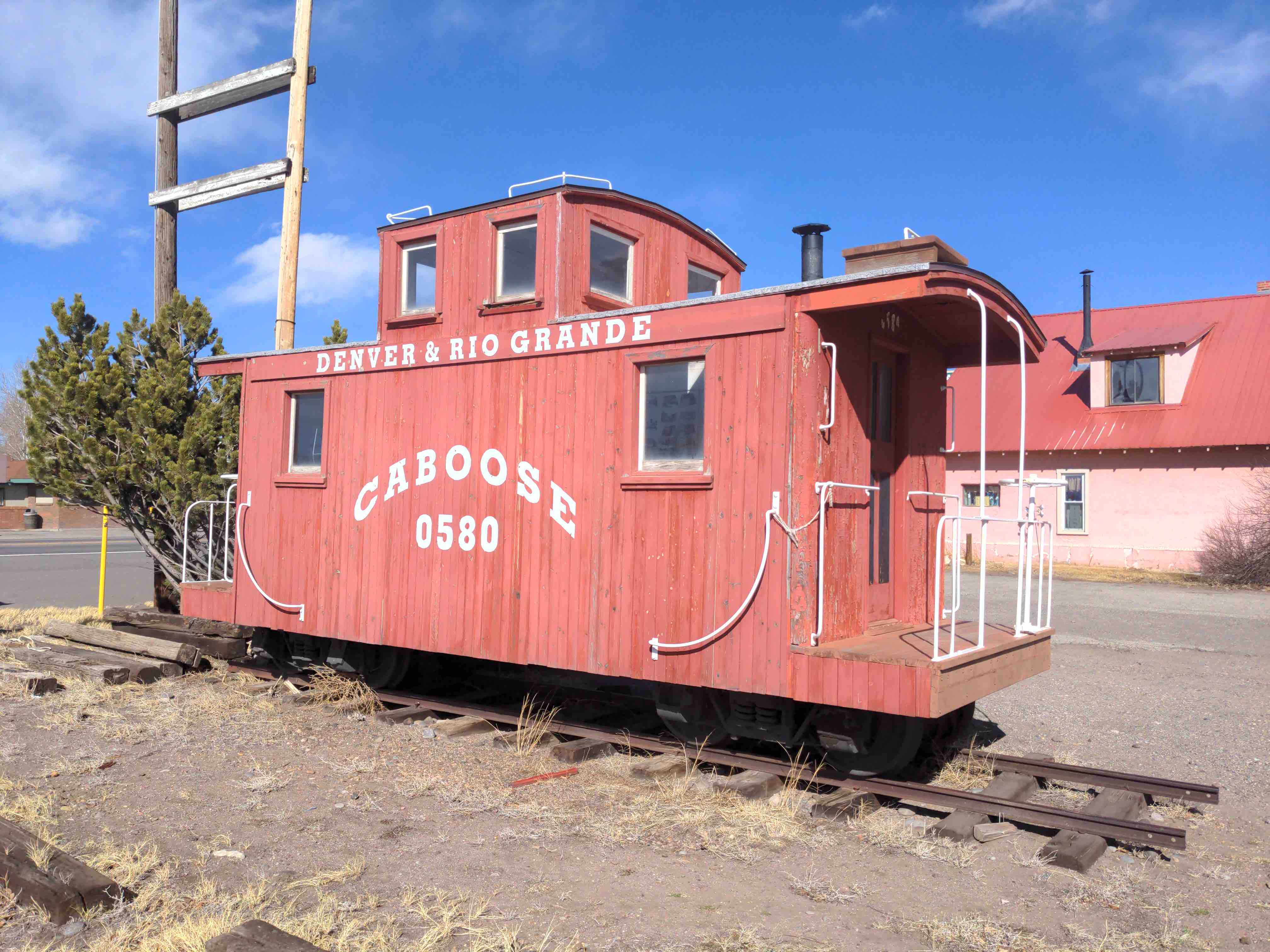 A loose caboose… Date: February 14, 2024Author: Museum Curator Category: Roadside Attraction Tags: caboose, Denver & Rio Grande, geotag roadside attraction, historic, history, railroad, rails, railway, roadside attraction, scenic railroad, scenic railway, tracks, train, train caboose Post navigation ← Meals on wheels… Get sidetracked here… → 37.678947 -106.357346 Denver & Rio Grande Caboose #0580. Show me where it is! A little red caboose welcomes you to Del Norte. Share this: Click to share on X (Opens in new window) X Click to share on Facebook (Opens in new window) Facebook Click to share on Pinterest (Opens in new window) Pinterest Click to share on Tumblr (Opens in new window) Tumblr Click to email a link to a friend (Opens in new window) Email Like Loading... Related