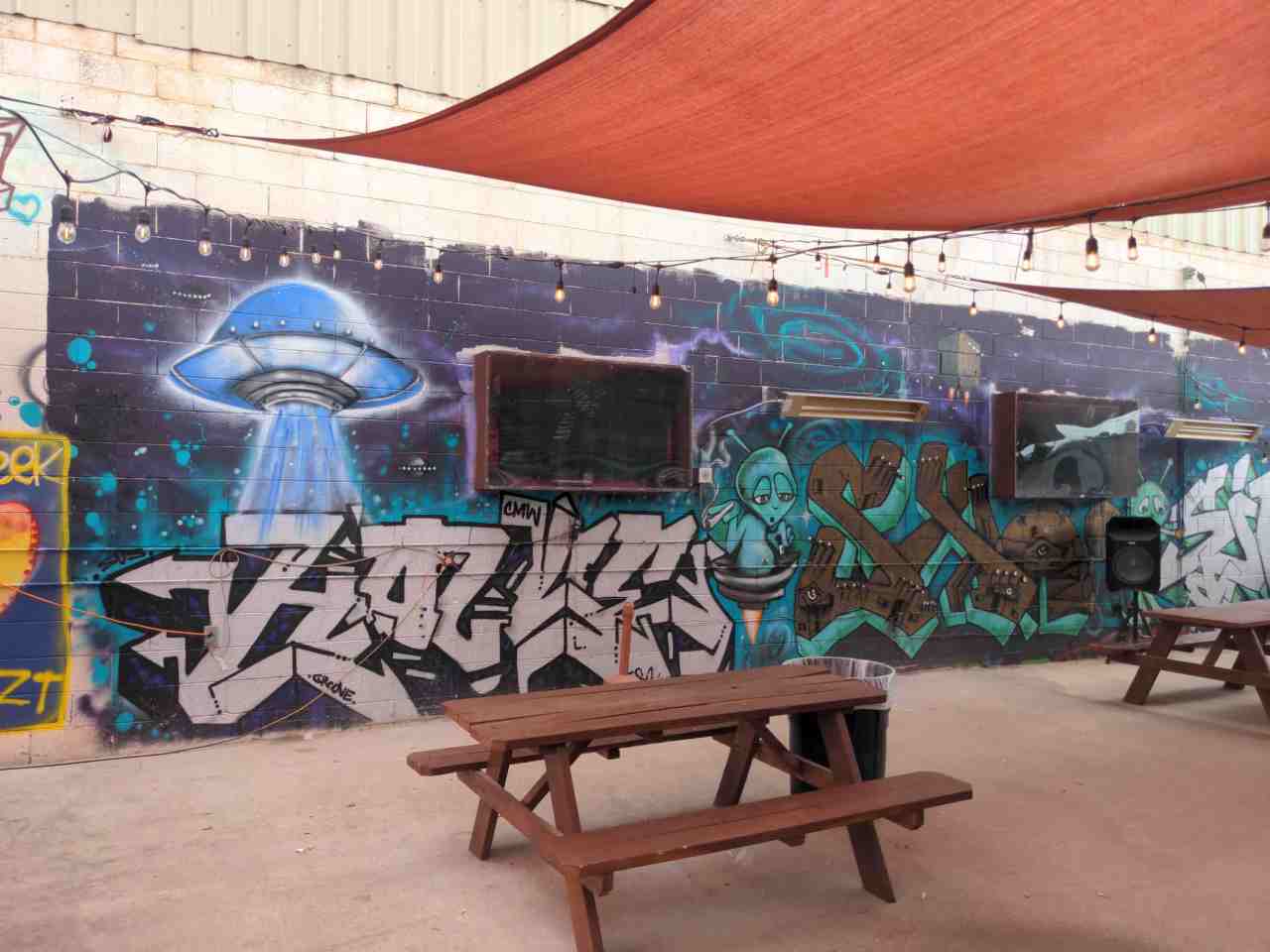 What could go wrong? Date: May 15, 2024Author: Museum Curator Category: Art, Food/Drink Tags: aliens, art, beer, flying saucer, food and drink, geotag art, half pipe, little green men, microbrew, microbrewery, mural, murals, outdoor patio, paintings, skateboard, skateboarding, space aliens, space visitors, street art, wall art Post navigation ← Aliens sell tires… Mmmm, donuts… → 33.37142 -104.51658 Black Cock Brewery outdoor patio features lots of cool murals and a half pipe. Take a ride! Show me where it is! Space aliens, beer, and a skateboard half pipe. What could possibly go wrong? Share this: Click to share on X (Opens in new window) X Click to share on Facebook (Opens in new window) Facebook Click to share on Pinterest (Opens in new window) Pinterest Click to share on Tumblr (Opens in new window) Tumblr Click to email a link to a friend (Opens in new window) Email Like Loading... Related