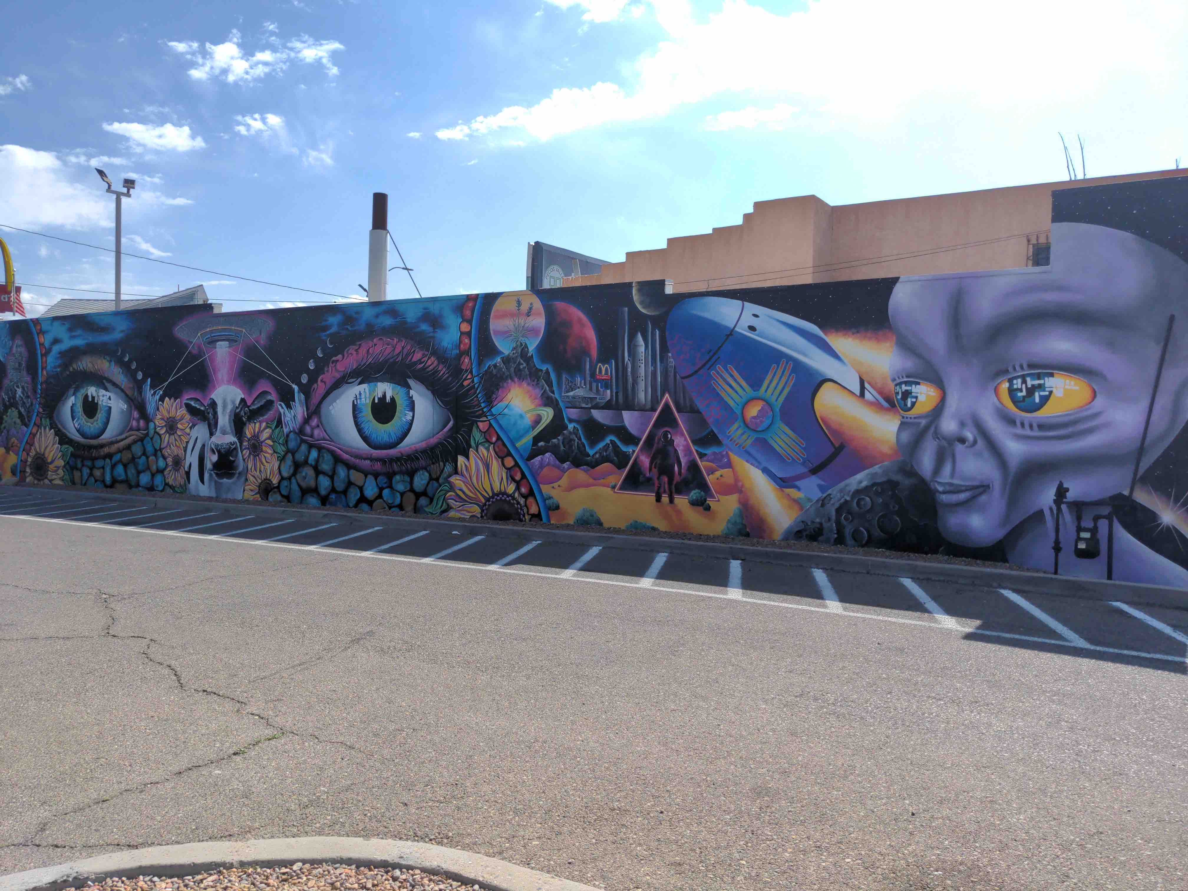What is it with aliens and cows? Date: June 5, 2024Author: Museum Curator Category: Art Tags: alien, alien visitor, aliens, art, cow, eyes, flying saucer, geotag art, mural, rocket ship, Roswell, space aliens, space creatures, space rocket, space ship, space visitors, visitor, wall art, wall painting Post navigation ← Get water here… Dig this ride… → 33.400013 -104.52339 Mural of aliens and other space creatures and a cow. Show me where it is! Share this: Click to share on X (Opens in new window) X Click to share on Facebook (Opens in new window) Facebook Click to share on Pinterest (Opens in new window) Pinterest Click to share on Tumblr (Opens in new window) Tumblr Click to email a link to a friend (Opens in new window) Email Like Loading... Related
