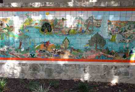 Mosaic sculpture of a giant pumpkin made with lots of orange tiles. Green tiles make the stem.